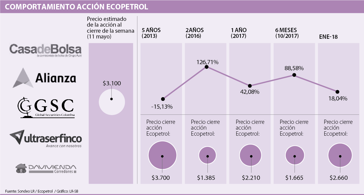 De acuerdo con los resultados financieros reportados por la compañía, y el comportamiento positivo que ha venido teniendo en lo corrido del año el petróleo, los analistas consultados por LR esperan que al cierre de la próxima semana el valor de la acción se ubique en $3.100 y “estimamos que sigan siendo positivos los resultados en el 2018. Así mismo que las utilidades sean mayores al cierre de este año a las que obtuvieron en 2017. De acuerdo a los resultados que dieron a conocer del primer trimestre del 2018, se esperaría que haya mejores dividendos pagados, teniendo en cuenta por ejemplo la recuperación de la Refinería de Cartagena”, señaló Felipe Espitia, analista económico de Alianza Valores.