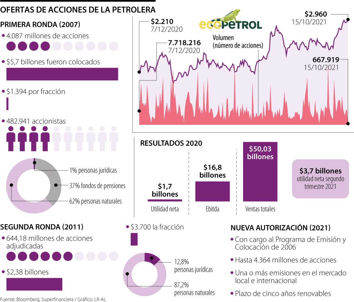 Con esta, serían tres las emisiones que ha llevado a cabo la empresa estatal. La primera ronda se desarrolló en 2007 por 4.087 millones de acciones para un total de $5,7 billones colocados, alcanzando un valor de $1.394 la fracción y con la participación de 482.941 accionistas. Del total de compradores, 62% correspondió a personas naturales, 37% a fondos privados de pensiones y cesantías y 1% a personas jurídicas.