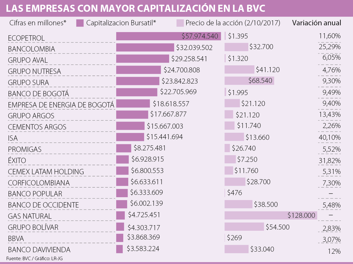 Tener la acción más costosa de la Bolsa de Valores no significa necesariamente tener la compañía con mayor capitalización bursátil, puesto que, según datos de la BVC, la empresa con mayor valor en bolsa es Ecopetrol, pues su valor está fijado en $57,9 billones, aunque su título es uno de los más bajos de la canasta, pues, en la jornada del lunes, cerró en $1.395.
