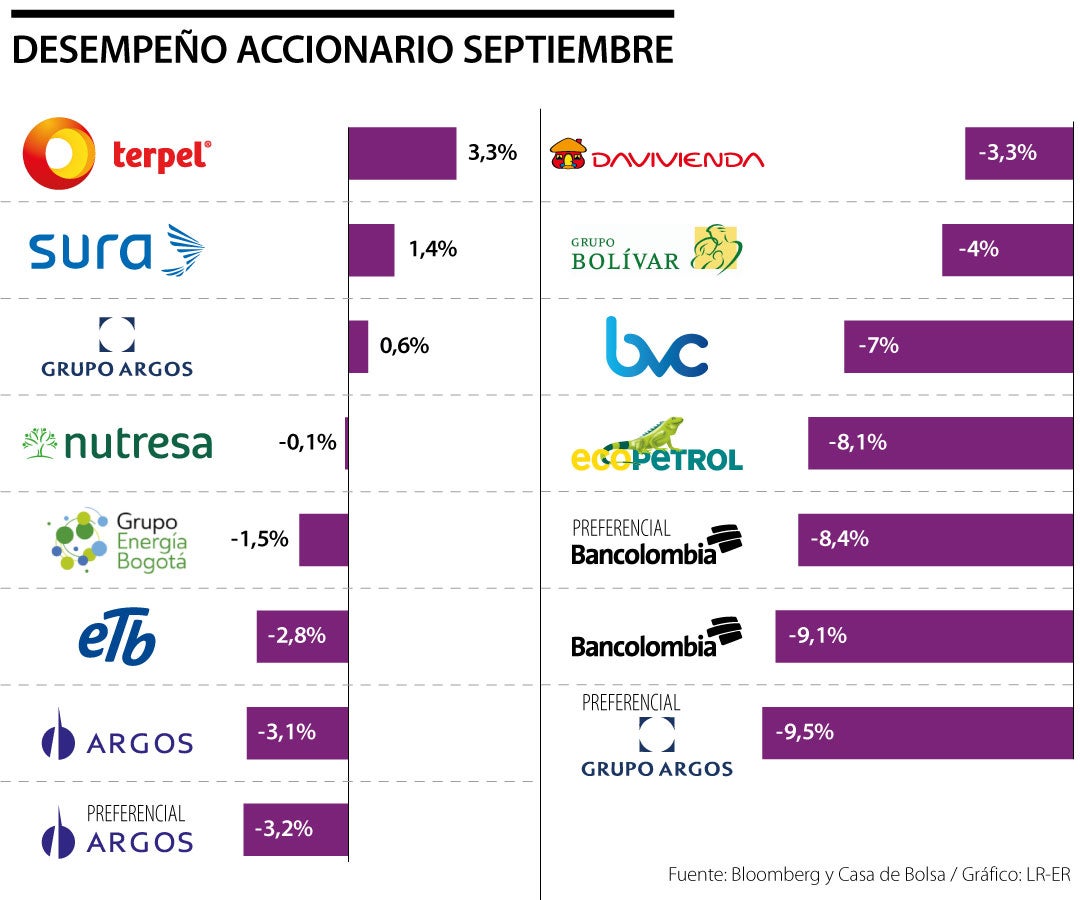 El desempeño accionario solo tuvo variaciones positivas para Terpel con 3.3%; Grupo Sura 1,4% y Argos 0.6%. Estas dos últimas se mantienen debido a la OPA por Nutresa, ya que el precio ofrecido por la empresa árabe fue de US$15 para la multinacional de alimentos y analistas especulan que podría haber otra oferta por parte de IHC por Sura.