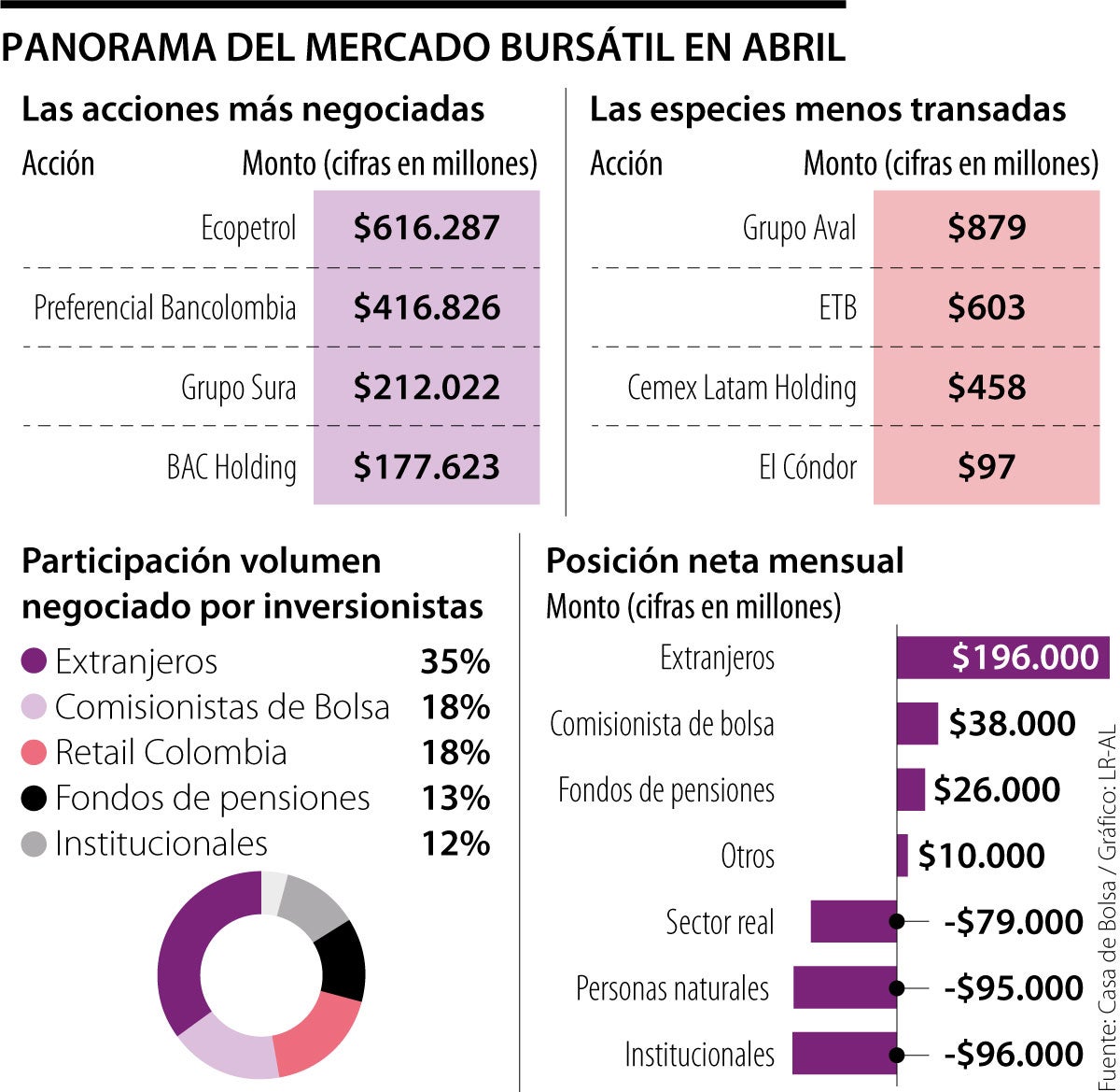 Los extranjeros siguieron liderando las negociaciones en la Bolsa de Valores de Colombia (BVC) con una participación de 35% del total transado y una posición neta mensual de $195.851 millones. Al cierre del cuarto mes del año, las acciones que más compraron fueron Inversiones Suramericana con $96.000 millones; seguida por la preferencial de Bancolombia, con $46.000 millones; Interconexión Eléctrica S.A., con $25.000 millones; Grupo Argos, con $10.000 millones y BAC Holding International, con $9.000 millones.