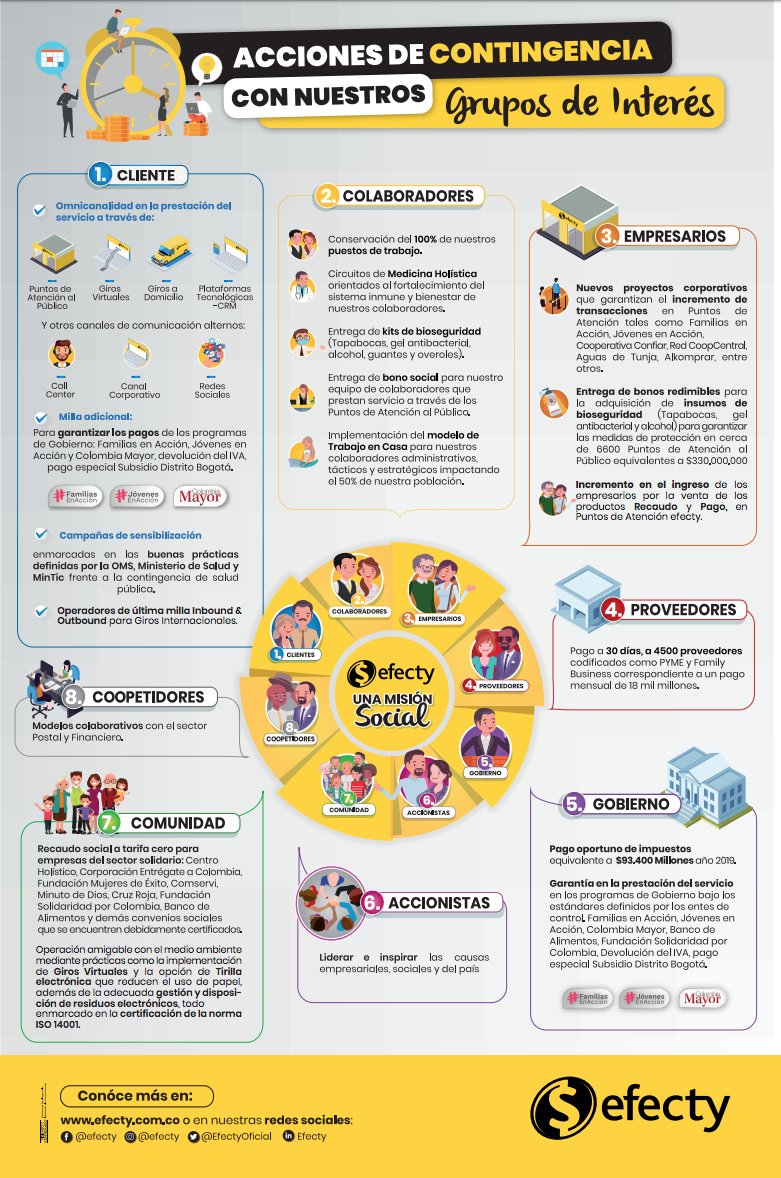 Gran parte de esta importancia se debe a la extensa cobertura que tiene Efecty en el territorio nacional, lo cual ha permitido que se lleven a cabo varias acciones del Gobierno enfocadas a mitigar la crisis, tales como la devolución del IVA y los programas Familias en Acción, Jóvenes en Acción y Colombia Mayor, cuyos recursos se pueden obtener en los puntos de servicio de la empresa.