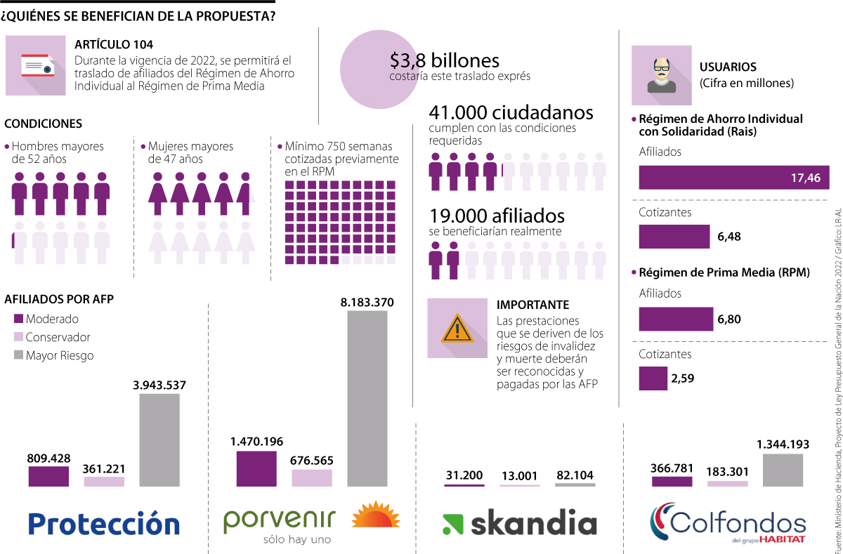 Dice el artículo 104 del presupuesto que, durante la vigencia de 2022, se permitirá el traslado de afiliados del Régimen de Ahorro Individual (Rais), gestionado por las AFP, al Régimen de Prima Media (RPM). Entre las condiciones que plantea, se establece que esta transición podría darse siempre y cuando sean hombres mayores de 52 años o mujeres mayores de 47 años.