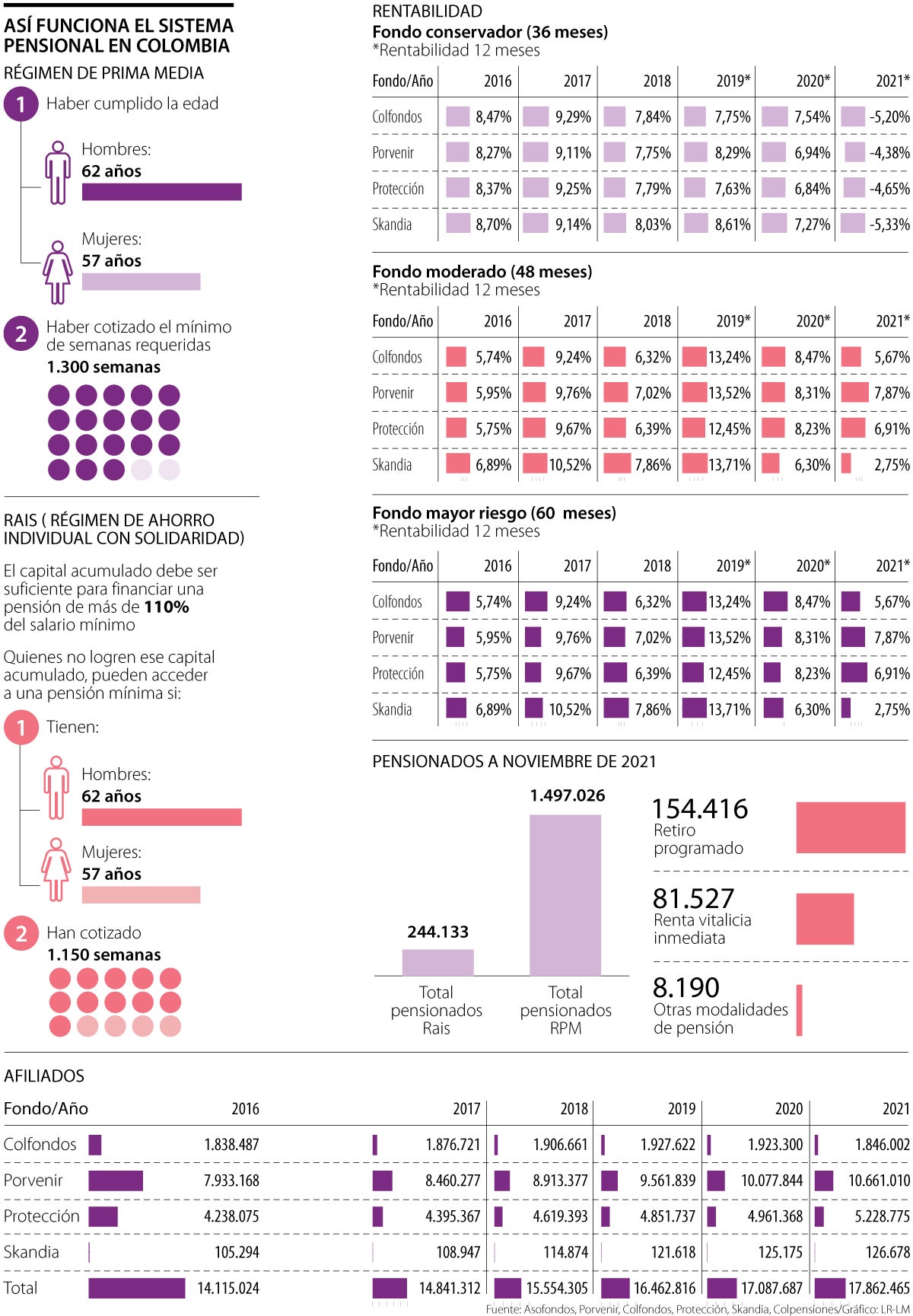 Si la persona está afiliada al Régimen Solidario de Prima Media con Prestación Definida (RPM), que es el modelo bajo el que opera el régimen público de Colpensiones, debe cotizar 1.300 semanas. Si se encuentra en el Régimen de Ahorro Individual con Solidaridad (Rais), que es el esquema de las cuatro Administradoras de Fondos de Pensiones privadas (AFP) mencionadas, debe alcanzar un ahorro de 110% de un salario mínimo.