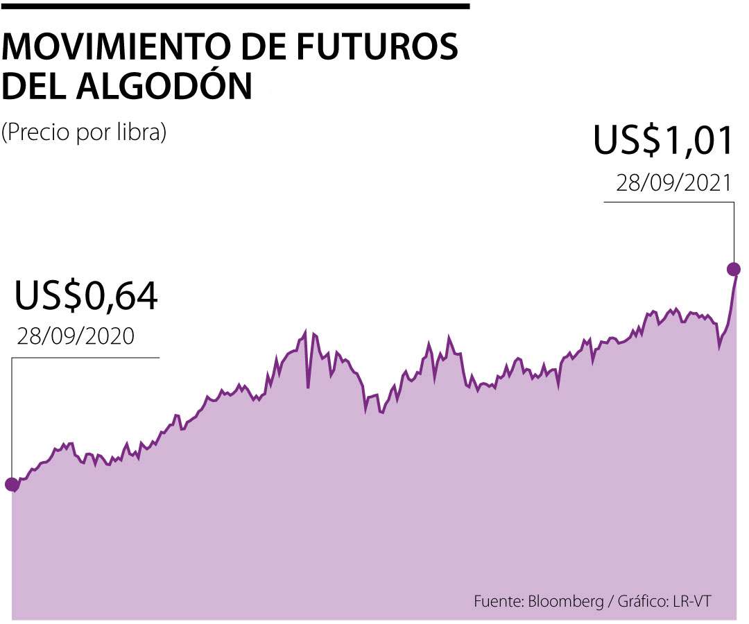 Los futuros del algodón superaron los US$101 por libra por primera vez en casi una década gracias a que el clima adverso y los obstáculos en el envío amenazan los suministros, lo que aumenta los costos de la ropa en todo el mundo.