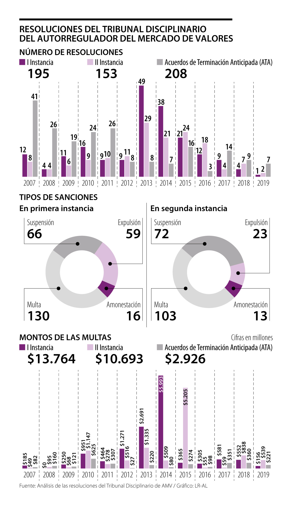 De acuerdo con el Análisis de las Resoluciones del Tribunal Disciplinario de AMV, realizado por la firma Ustariz & Abogados, de las investigaciones de los últimos 13 años, se han dado 195 en primera instancia, 153 en segunda instancia y 208 han sido acuerdos de terminación anticipada (ATA).
