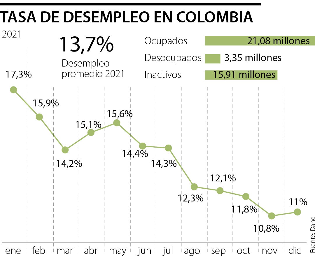 El desempleo bajó, dato que también podría favorecer al peso. El Departamento Administrativo Nacional de Estadística (Dane) informó que en 2021 hubo 3,35 millones de personas desocupadas, con lo que la tasa de desempleo llegó a 13,7%, lo que representó una reducción de 2,2 puntos porcentuales frente a 2020. Un total de 404.000 personas salieron de la situación de desempleo en el último año.