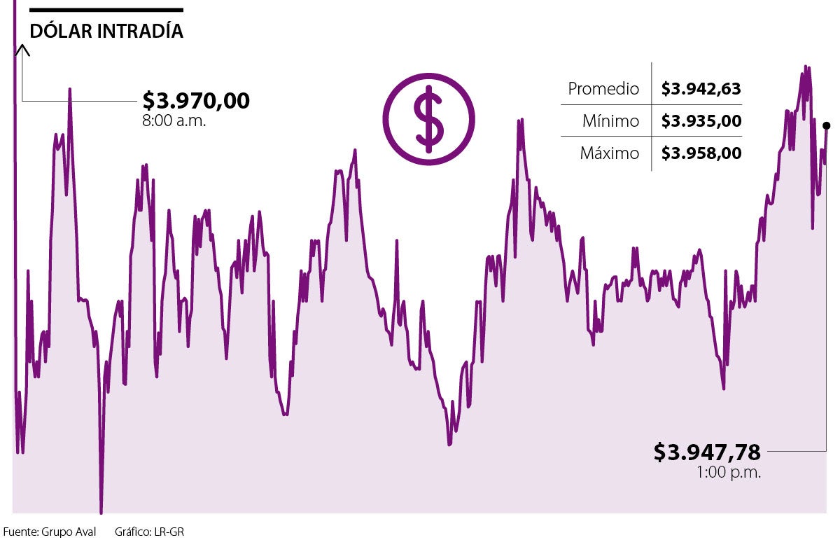 Ayer, el dólar cerró con un precio promedio de $3.942,63, lo cual representó una caída de $39,97 frente a la Tasa Representativa del Mercado (TRM), que se ubicó en $3.982,60. La divisa alcanzó a caer a $3.935, mientras que el máximo alcanzado fue $3.958.