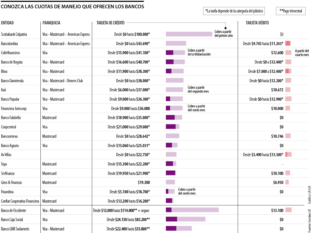 La República consultó entre las entidades financieras que ofrecen tarjetas de crédito y encontró que los cobros de cuota de manejo van desde $0 hasta $102.000. (Para el ejercicio periodístico se tomó en cuenta la información publicada por los bancos en sus portales web y se tuvieron en cuenta los productos tradicionales que ofrece la banca).
