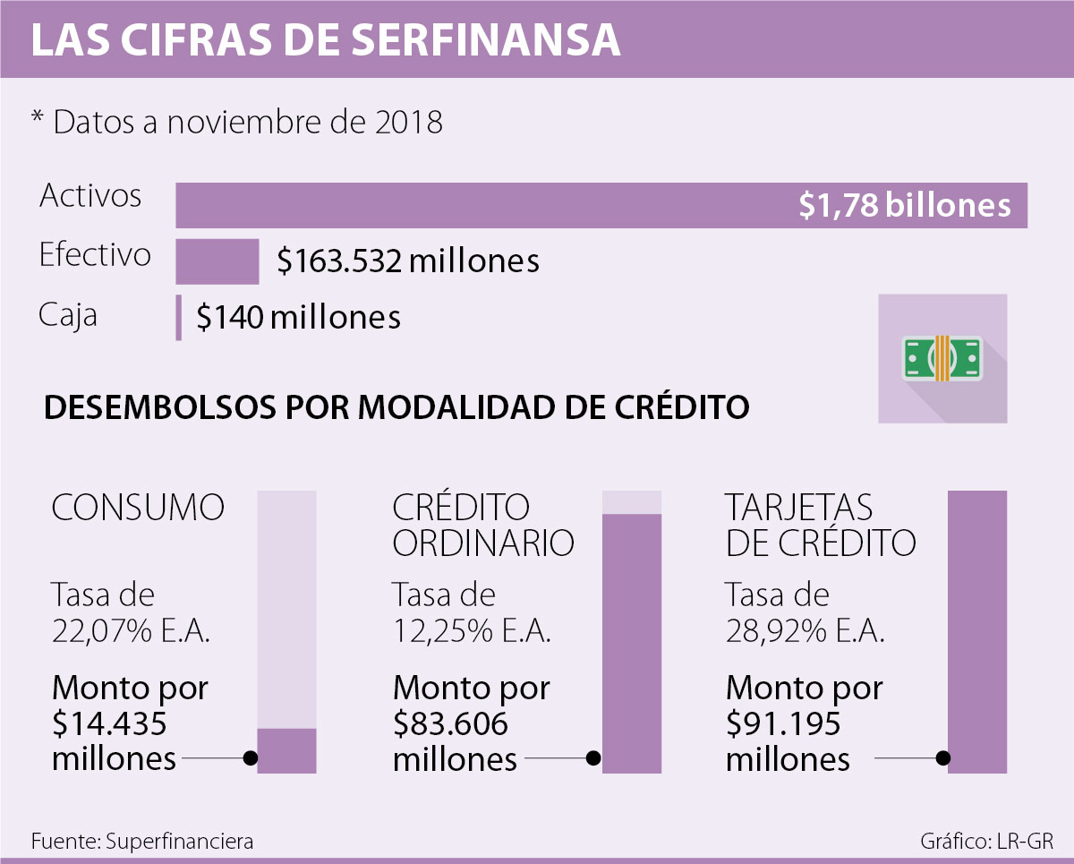 De acuerdo con el último reporte a la Superfinanciera, con corte a noviembre de 2018, Serfinansa cuenta con activos por $1,78 billones, un efectivo por $163.532 millones y una caja de $140 millones.