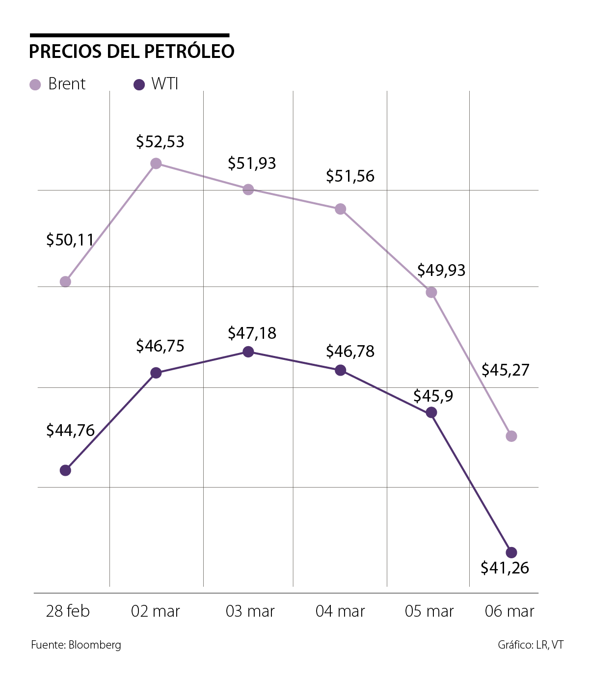 Los precios de ambas referencias se impactaron tras conocerse la negativa de Rusia sobre reducir la producción de crudo