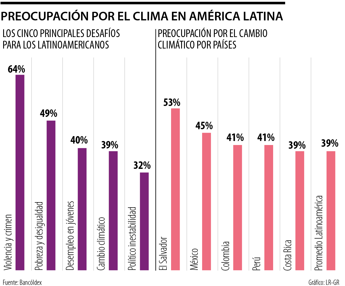 De acuerdo con la encuesta, solo 39% de los latinoamericanos cree que el cambio climático y la degradación ambiental es uno de los principales desafíos de la región. El tema ocupa el cuarto lugar entre los desafíos que más les preocupa a los latinos, por detrás de otras problemáticas como la violencia y crimen (64%), pobreza y desigualdad (49%) y el desempleo, particularmente entre los jóvenes (40%).