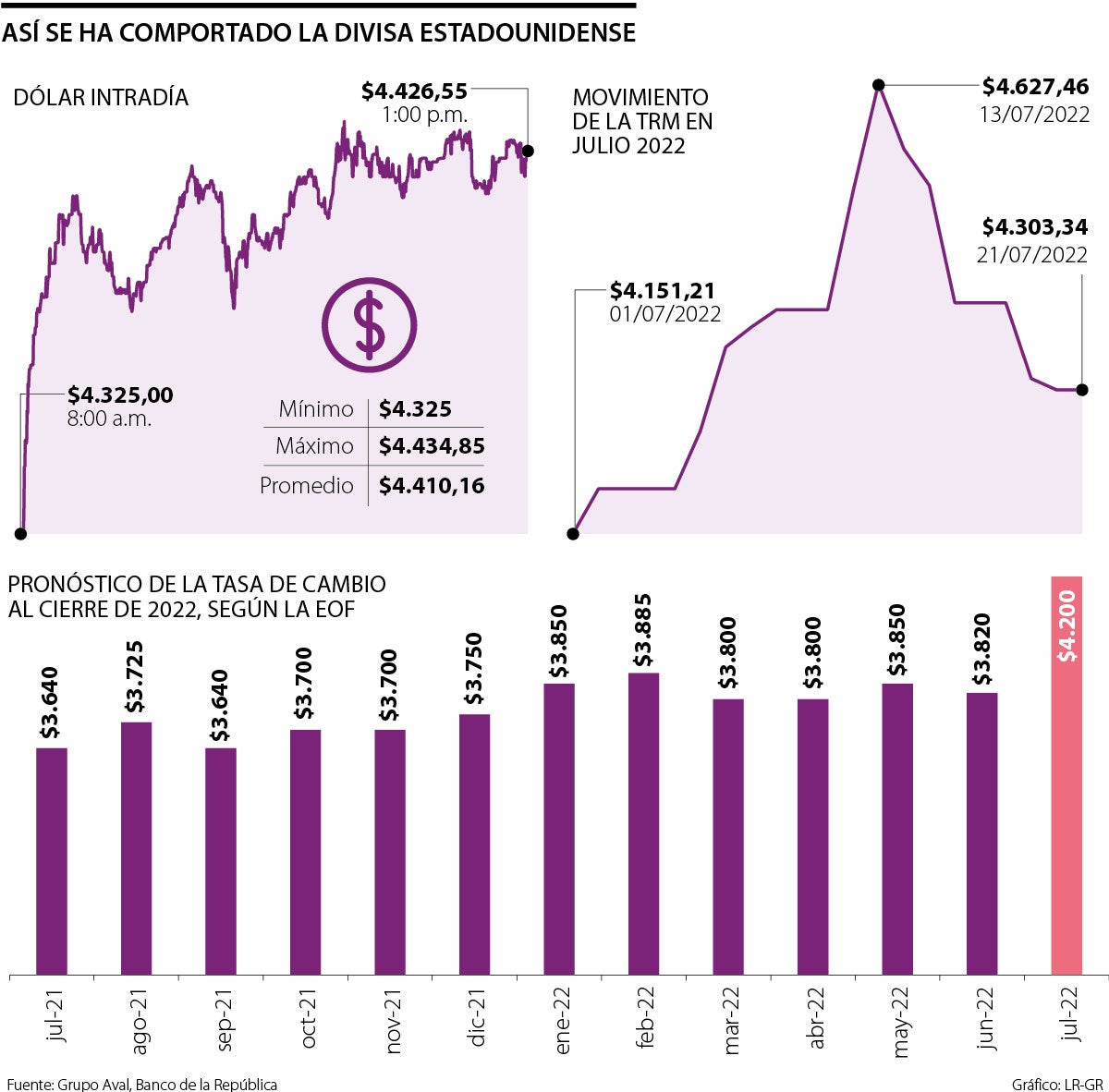 Ahora bien, para finales de julio, los analistas consideran que la tasa de cambio se ubicará en un rango entre $4.365 y $4.546, con $4.495 como respuesta mediana.