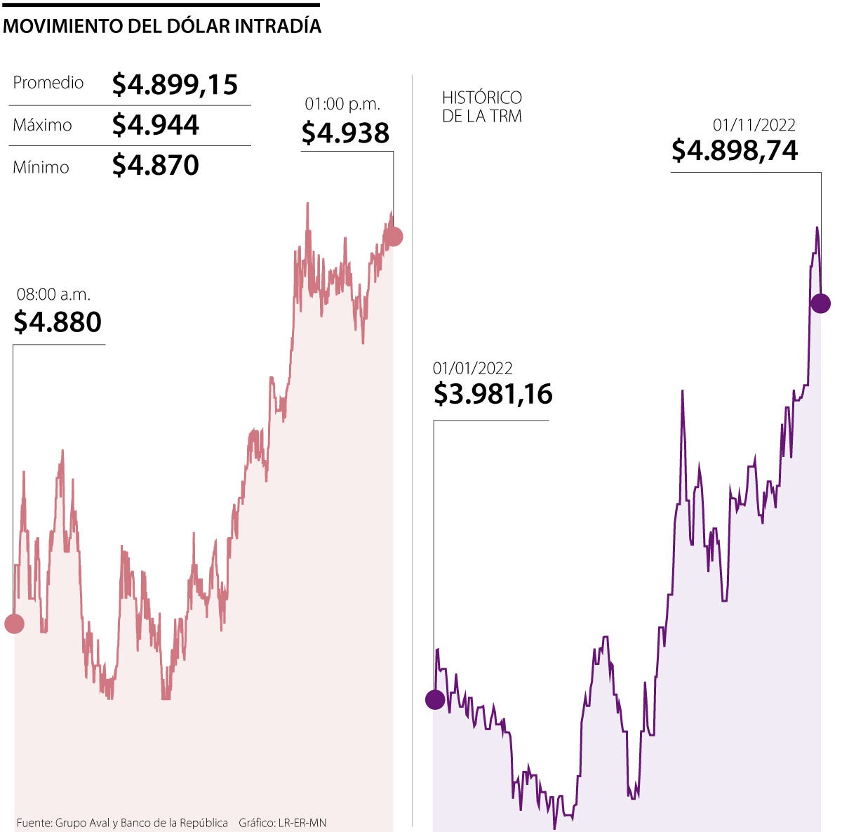Este lunes, el dólar cerró a $4.899 en promedio, lo cual representó un aumento de $79,73 frente a la Tasa Representativa del Mercado (TRM), que para la jornada se ubicó en $4.819,42.