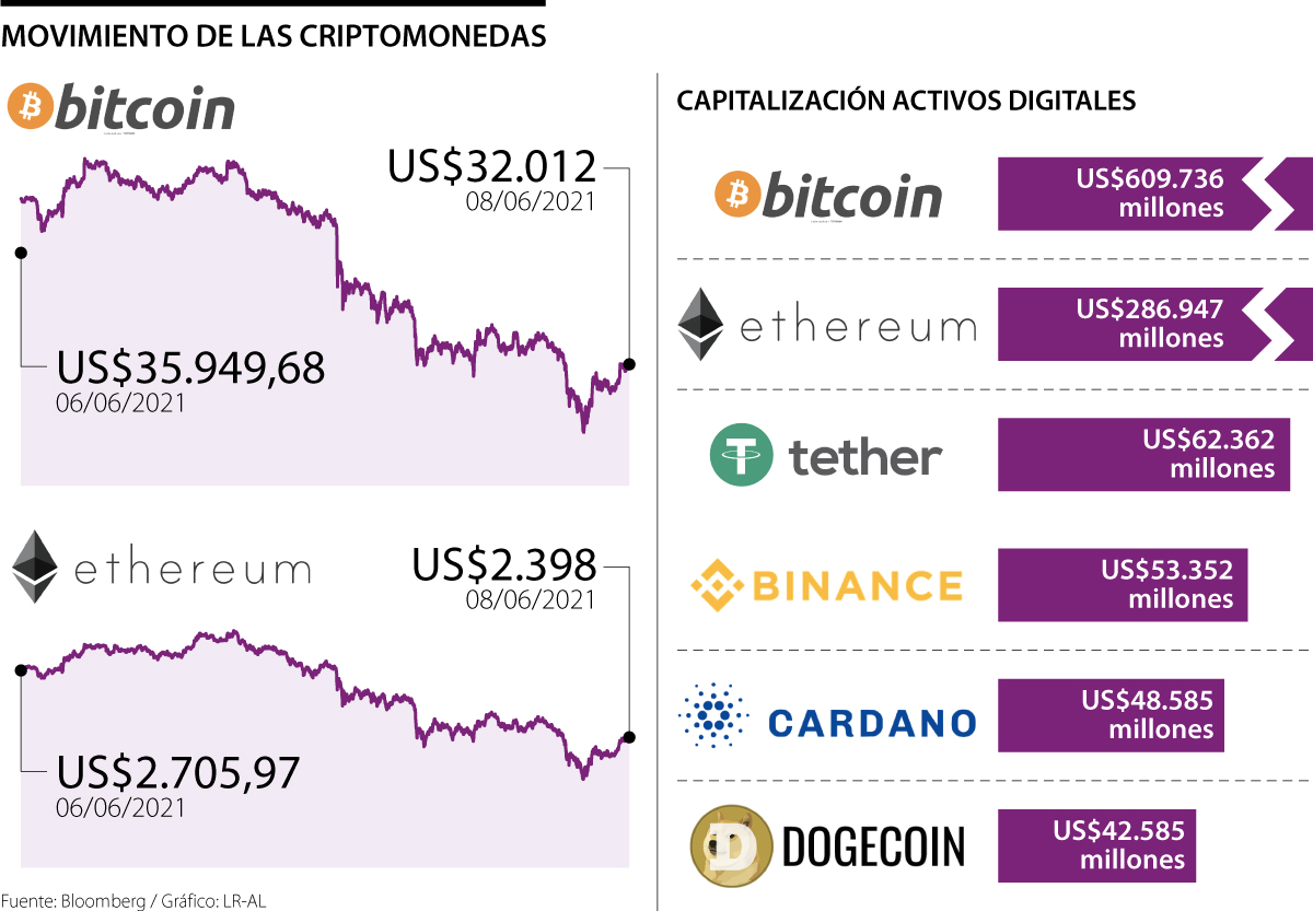 La criptomoneda de mayor capitalización, el bitcoin, (US$609.736 millones) cayó 10,54% a US$32.012, mientras que el ethereum, con US$286.947 millones de capitalización, bajó 13,20% a US$2.398. Binance coin disminuyó 14,42% a US$336 y la popular dogecoin perdió 10,93% a US$0,315.