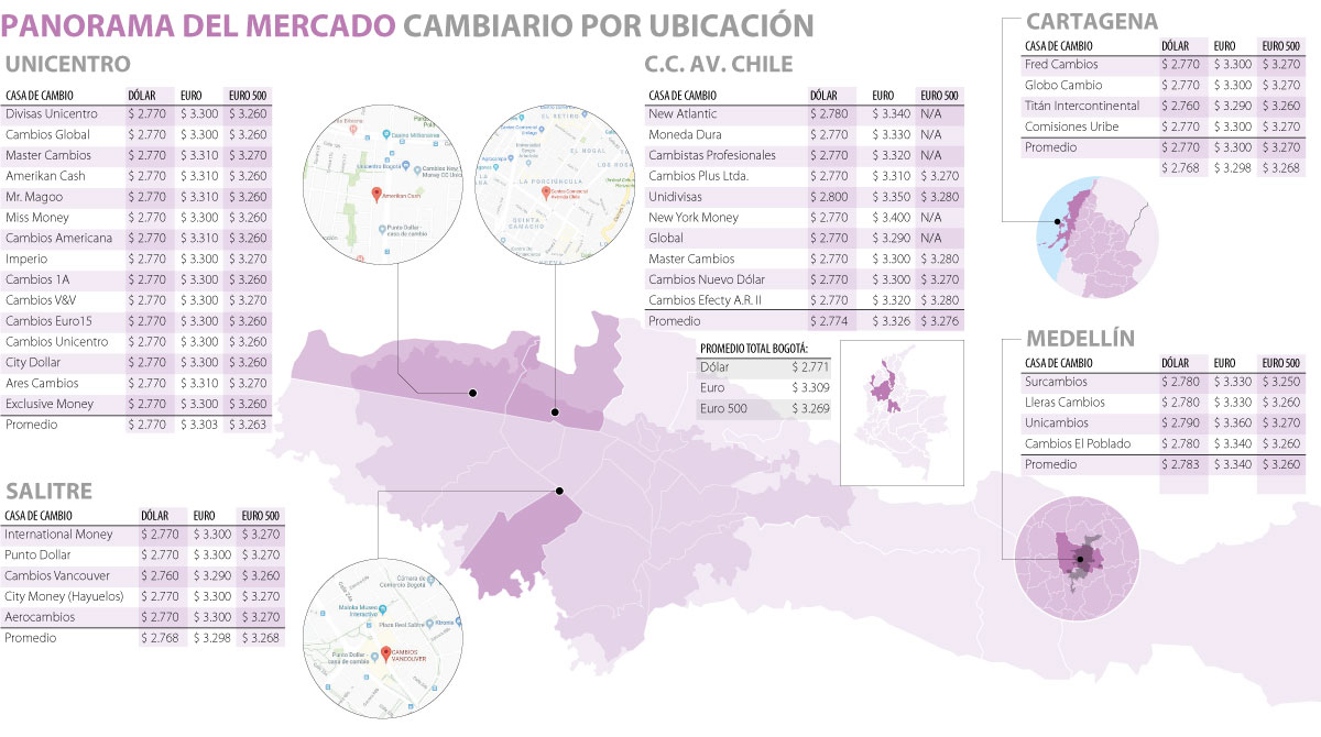 Consultamos 30 de las principales casas de cambio a las que acuden los bogotanos y ocho firmas diferentes en Cartagena y Medellín para dar cuenta de las variaciones en precios de venta tanto para dólar como euro de acuerdo con la ubicación.