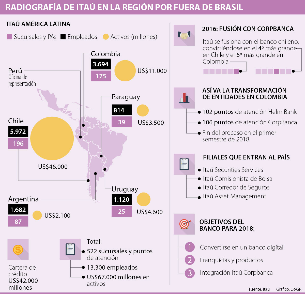 Tras la fusión con el banco chileno CorpBanca en 2016, el gigante brasileño Itaú busca convertirse en un jugador relevante dentro del mercado minorista colombiano. En la actualidad, el cambio de marca de las sucursales bancarias, que empezó con los puntos de atención de la antigua red Helm Bank el pasado 22 de mayo, y siguió tres meses después con los de CorpBanca, ya completa 77% del total y se espera que acabe el primer semestre de 2018.