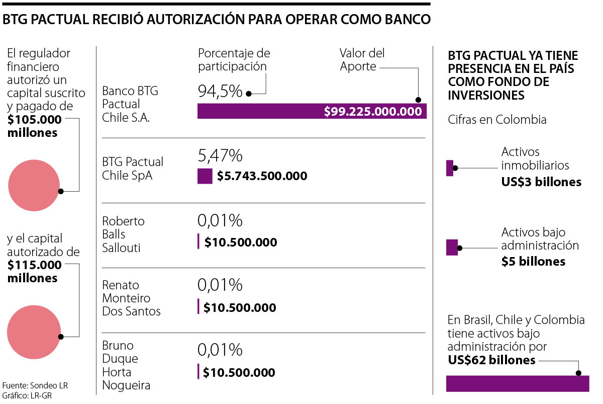 El regulador financiero autorizó un capital suscrito y pagado en la fecha de constitución de la entidad bancaria de $105.000 millones, de los cuales 94,5% será aportado por el Banco BTG Pactual Chile S.A. El capital total autorizado es de $115.000 millones.