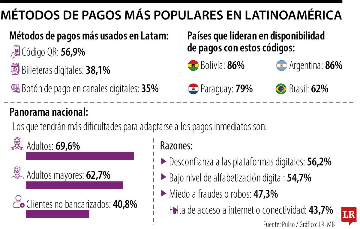 Dentro de cada país, la disponibilidad de pagos con estos códigos varía, pero los países que lideran este aspecto son Bolivia (86%), Paraguay (79%), Argentina (86%) y Brasil (62%).
