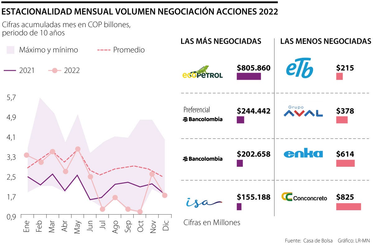 Las acciones más negociadas en diciembre fueron Ecopetrol ($805.860 millones), seguido de preferencial Bancolombia ($244.442 millones) e ISA ($155.188 millones). A pesar de que siguen siendo los títulos más cotizados, ese mes reflejaron una disminución significativa en comparación con noviembre, momento en el cual Ecopetrol tuvo un total de negociaciones por hasta $1,3 billones, PF Bancolombia tuvo $169.342 millones e ISA $132.198 millones. En contraste, las especies menos negociadas fueron ETB, Grupo Aval, Enka y Conconcreto.