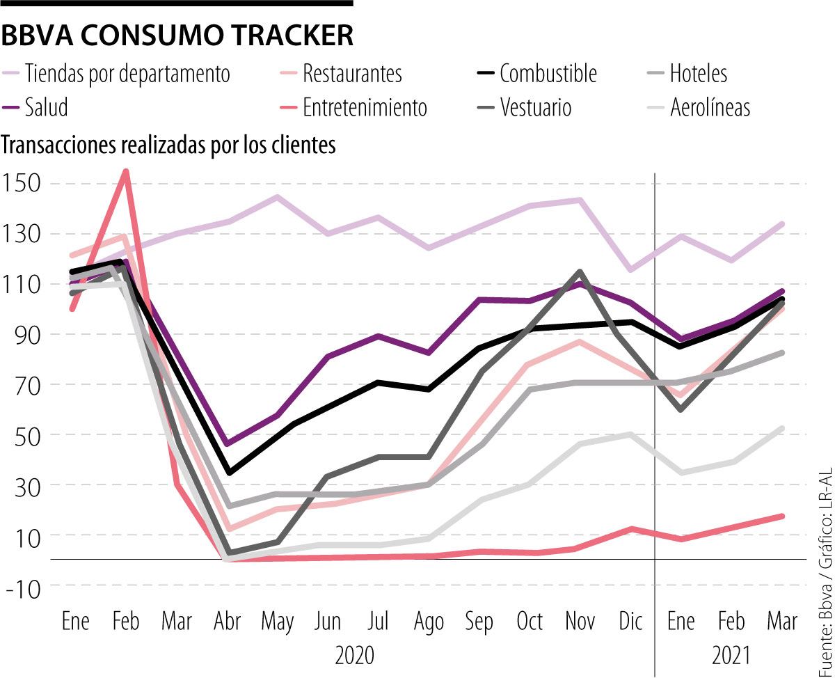 La reactivación en turismo es evidente en el estudio del banco. En lo corrido de marzo se destacó el impulso que registran sectores como restaurantes, hoteles y aerolíneas. El gasto en restaurantes se consolida por encima de los niveles de 2019, es decir que ya se recuperó totalmente de los efectos de las restricciones de movilidad de enero. También se evidenció un mayor gasto en hoteles, lo que posiblemente estuvo asociado a la temporada de Semana Santa, según indicó la entidad financiera. Por último, el gasto en aerolíneas muestra también un potencial anticipo del periodo de vacaciones de abril.