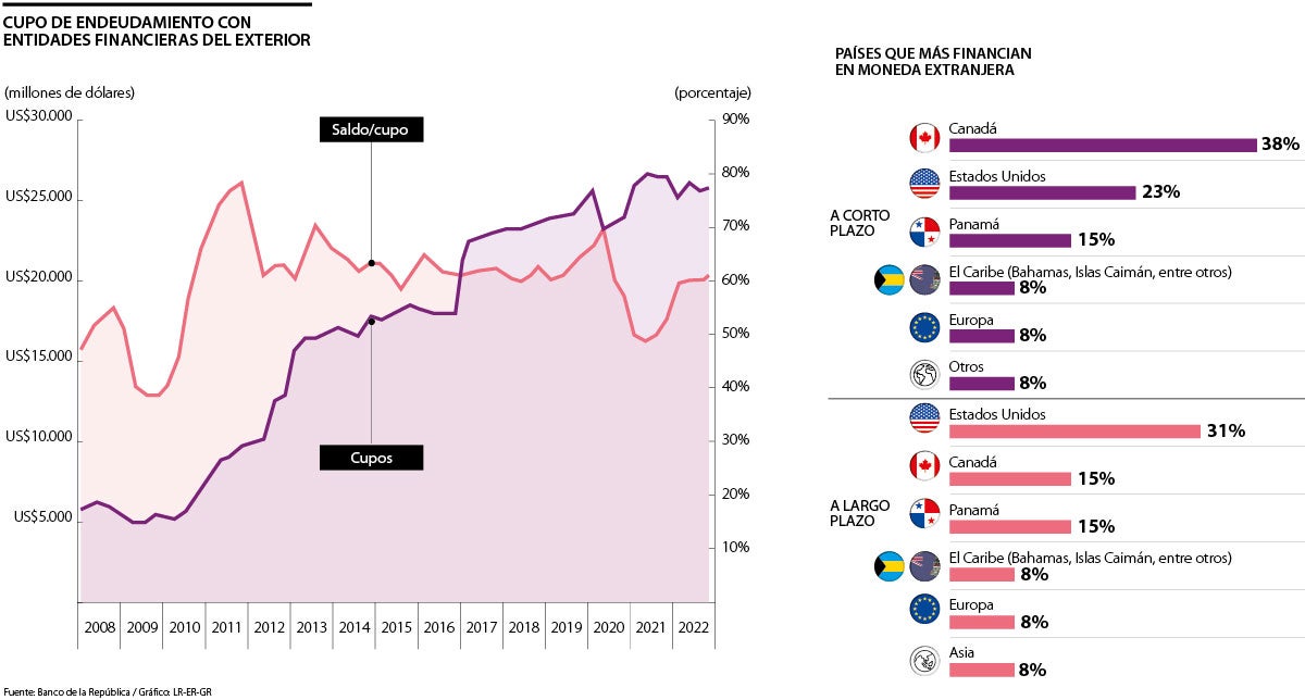 Es así como el cupo del endeudamiento externo por parte de los bancos que operan en Colombia aumentó a US$25.739 millones, registrando con esto un aumento trimestral de 0,8 %, pero una caída entre 2022 y 2021 de 2,6%.