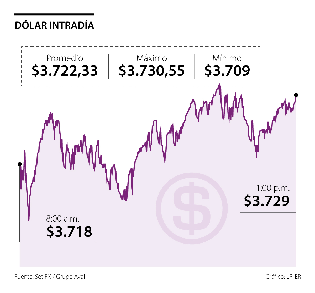 El miércoles, el dólar alcanzó un precio promedio de $3.722,33, lo que representó un alza de $16,27 frente a la Tasa Representativa del Mercado (TRM), que se ubicó en $3.706,06.