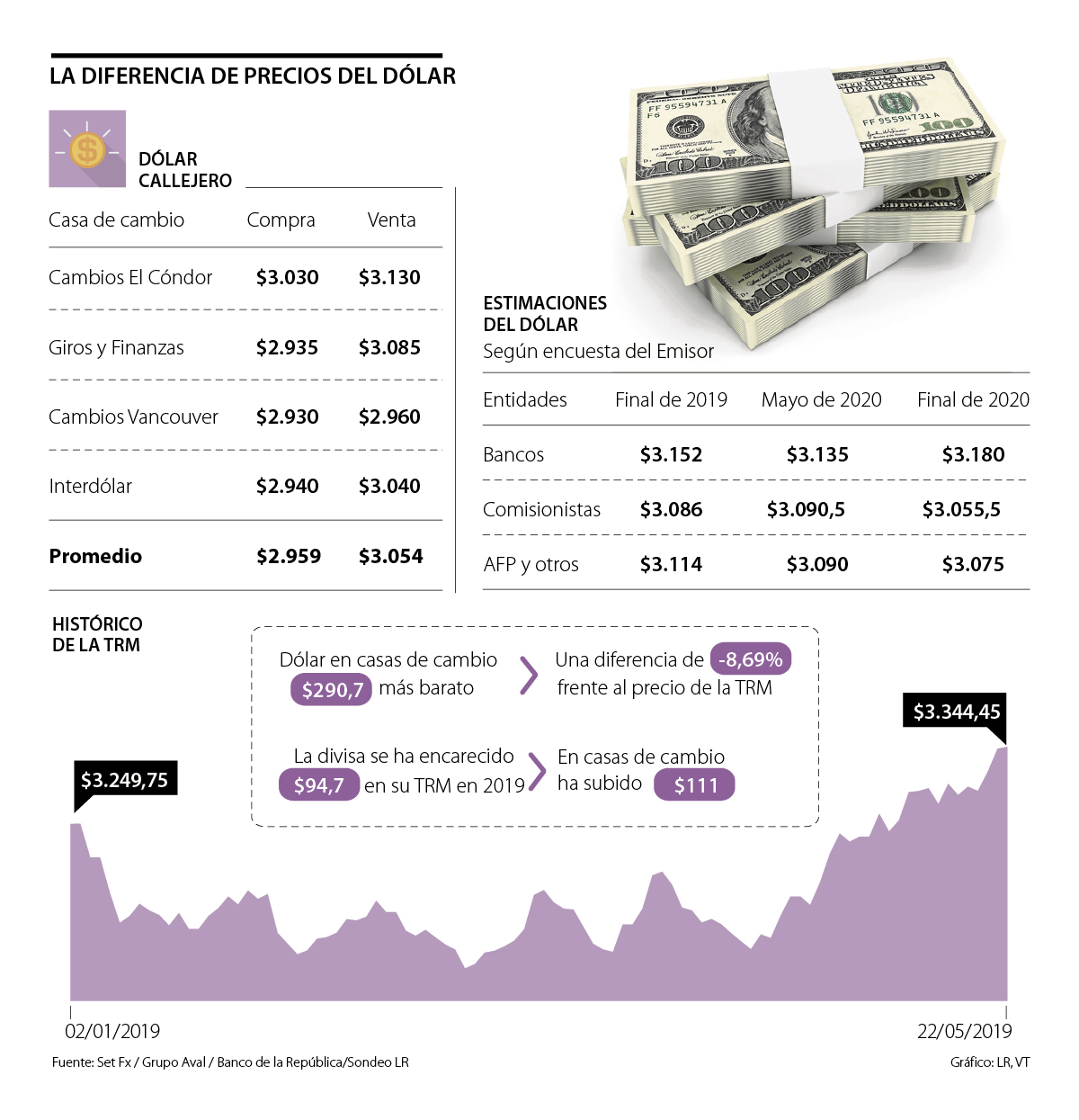 Sin embargo, según la encuesta de expectativas de analistas económicos realizada por el Banco de la República a 39 entidades entre bancos, firmas comisionistas, AFP y otros, la TRM puede bajar hasta $3.120 según la proyección promedio para fin de año, hasta $3.117,50 en un año y retornar a $3.120 a final de 2020.