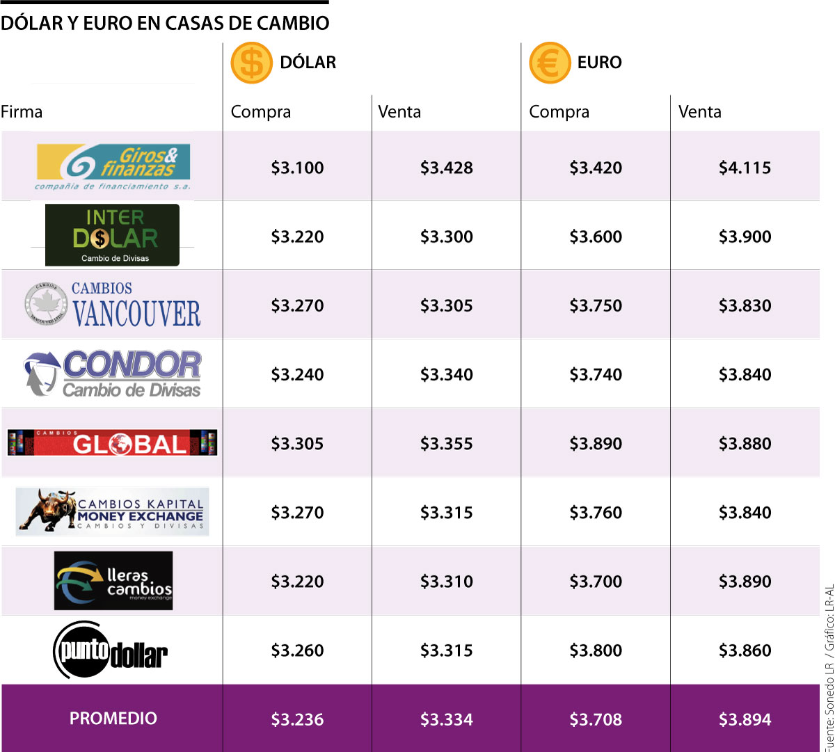 El valor más bajo lo encuentra en Giros y Finanzas, a $3.100. y el más alto en Cambios Vancouver y Cambios Kapital, a $3.270.