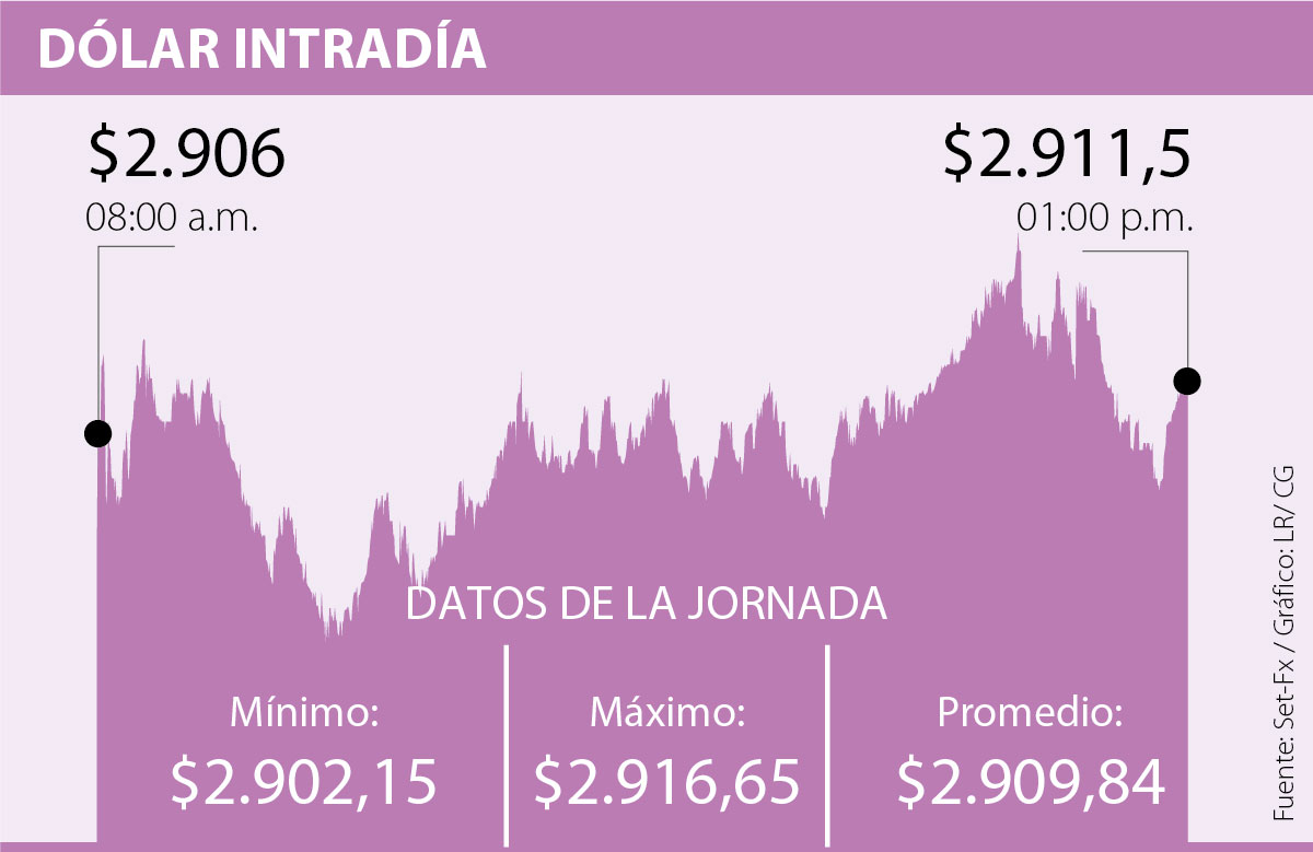 En la jornada del miércoles la divisa abrió el día con un precio de $2.906 y su cierre fue de $2.911,25. El precio mínimo que se registró en la plataforma Set-Fx fue de $2.902,15; mientras que el máximo fue $2.916,65.