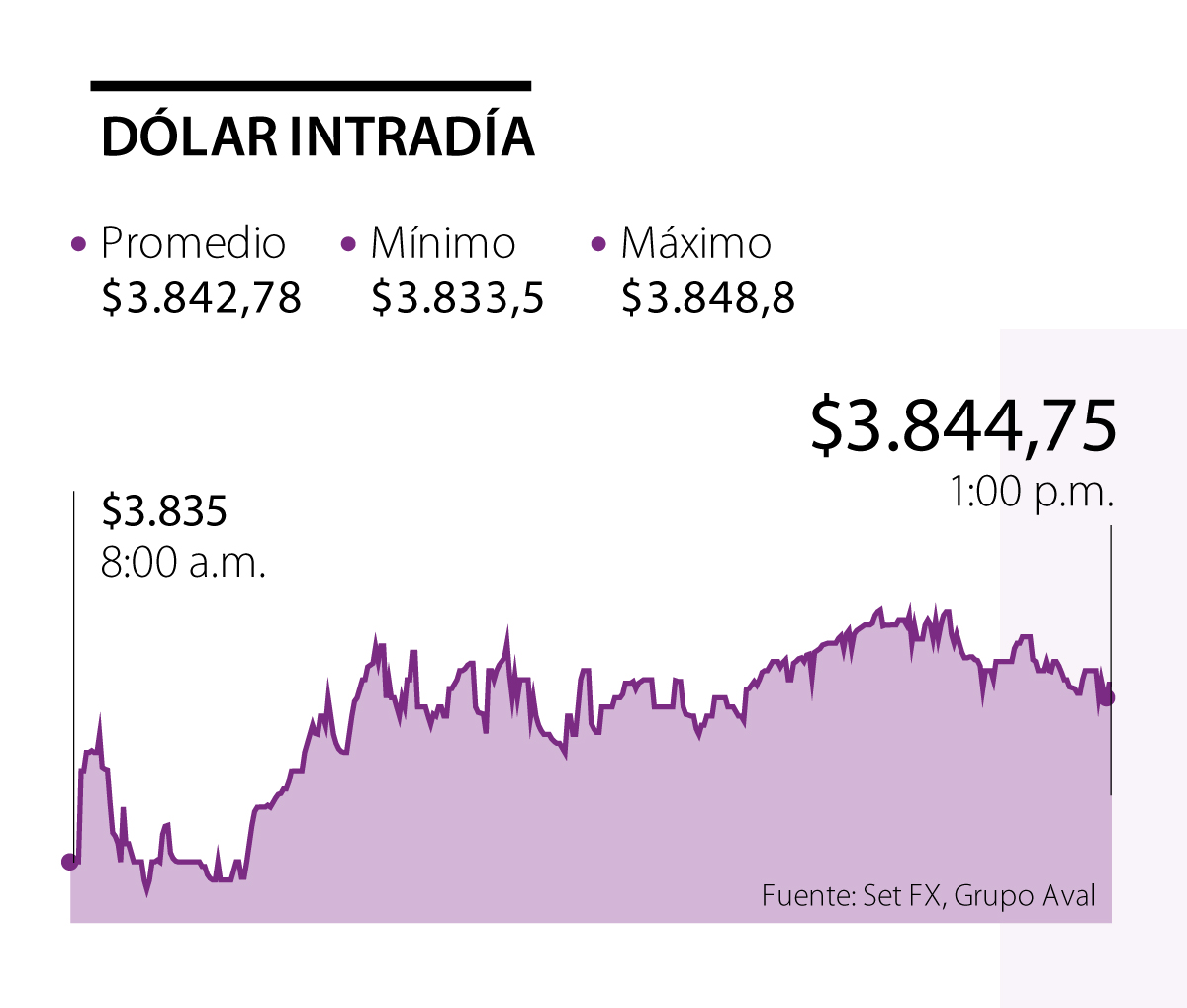 La divisa abrió la jornada con un precio de $3.835 y su cierre fue de $3.844,75. El precio mínimo que se registró en la plataforma Set-Fx fue de $3.833,50, mientras que el máximo fue $3.848,80. El monto negociado durante la jornada fue de US$378,71 millones en 594 transacciones.