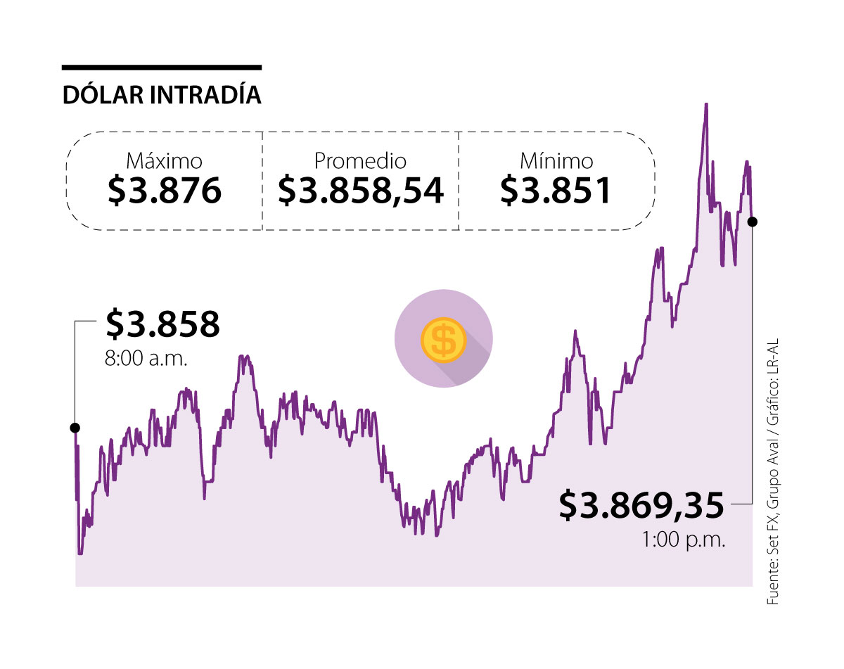 El dólar alcanzó el viernes un precio promedio de $3.858,54, lo que representó un alza de $9,01 frente a la tasa representativa del mercado (TRM), que se ubicó en $3.849,53.
