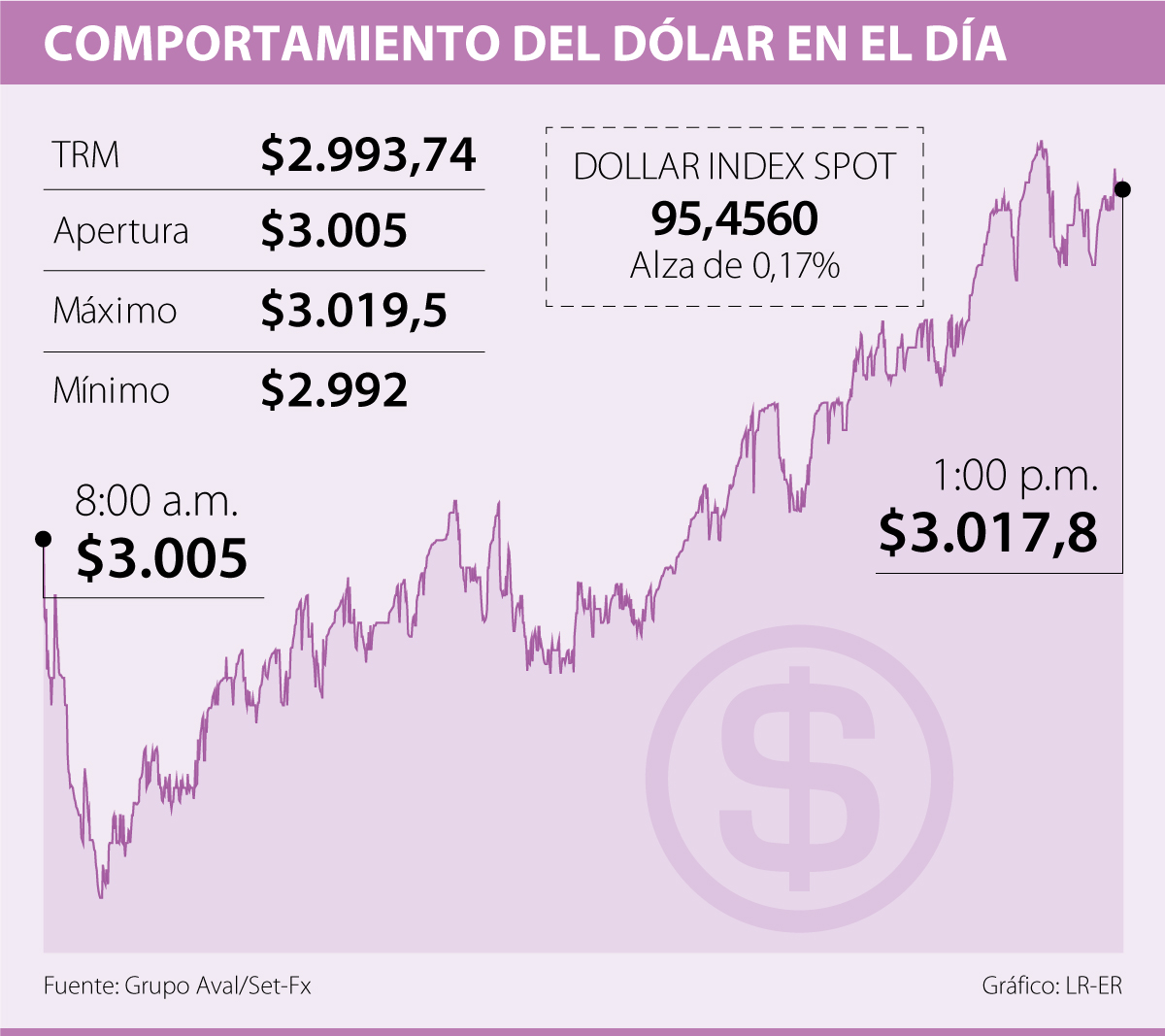 De esta manera en el mercado nacional, el dólar cerró con un precio promedio de $3.005,46, lo que representó un alza de $11,72 frente a la TRM del día, que ayer se ubicaba en $2.993,74. Por su parte, el precio de apertura estuvo en $3.005 y su cierre fue de $3.017,8, con lo que ganó 0,42% en la sesión.