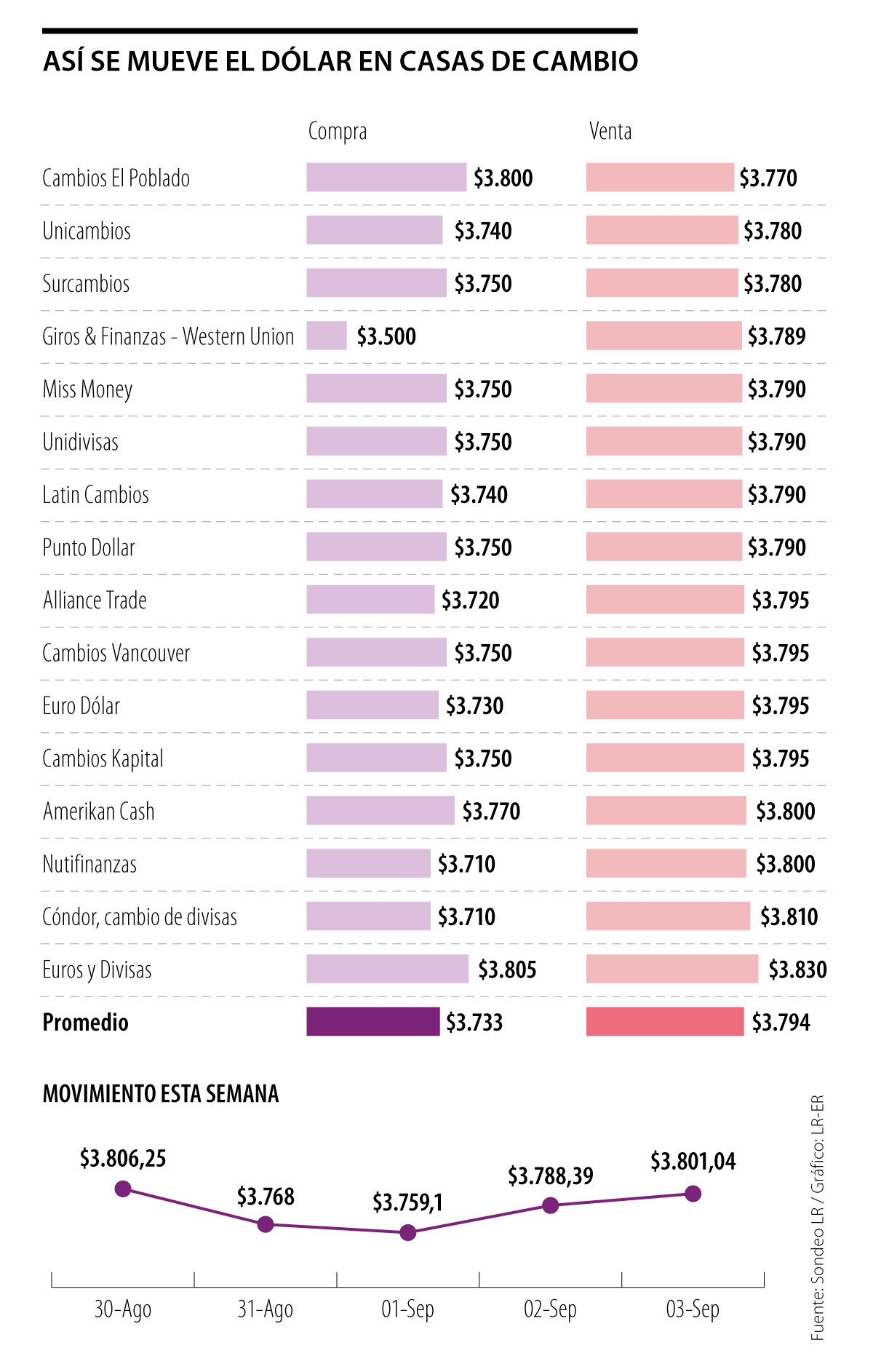 Las casas que más barato la ofrecen son Cambios El Poblado, a $3.770; seguida por Unicambios y Surcambios, a $3.780; Giros & Finanzas, a $3.789; y Miss Money, a $3.790.