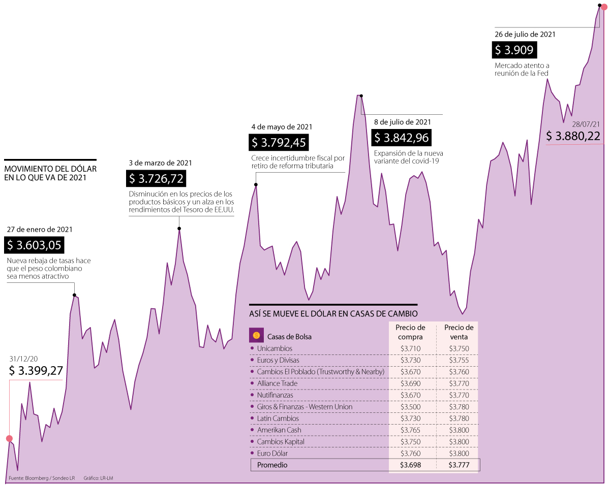 A pesar del alza de la tasa oficial, la divisa se vende a $3.777 en promedio en las casas de cambio; esto significa $141,49 por debajo de la Tasa Representativa del Mercado (TRM), que manejan los bancos y que para la más reciente jornada se ubicó en $3.918,49.
