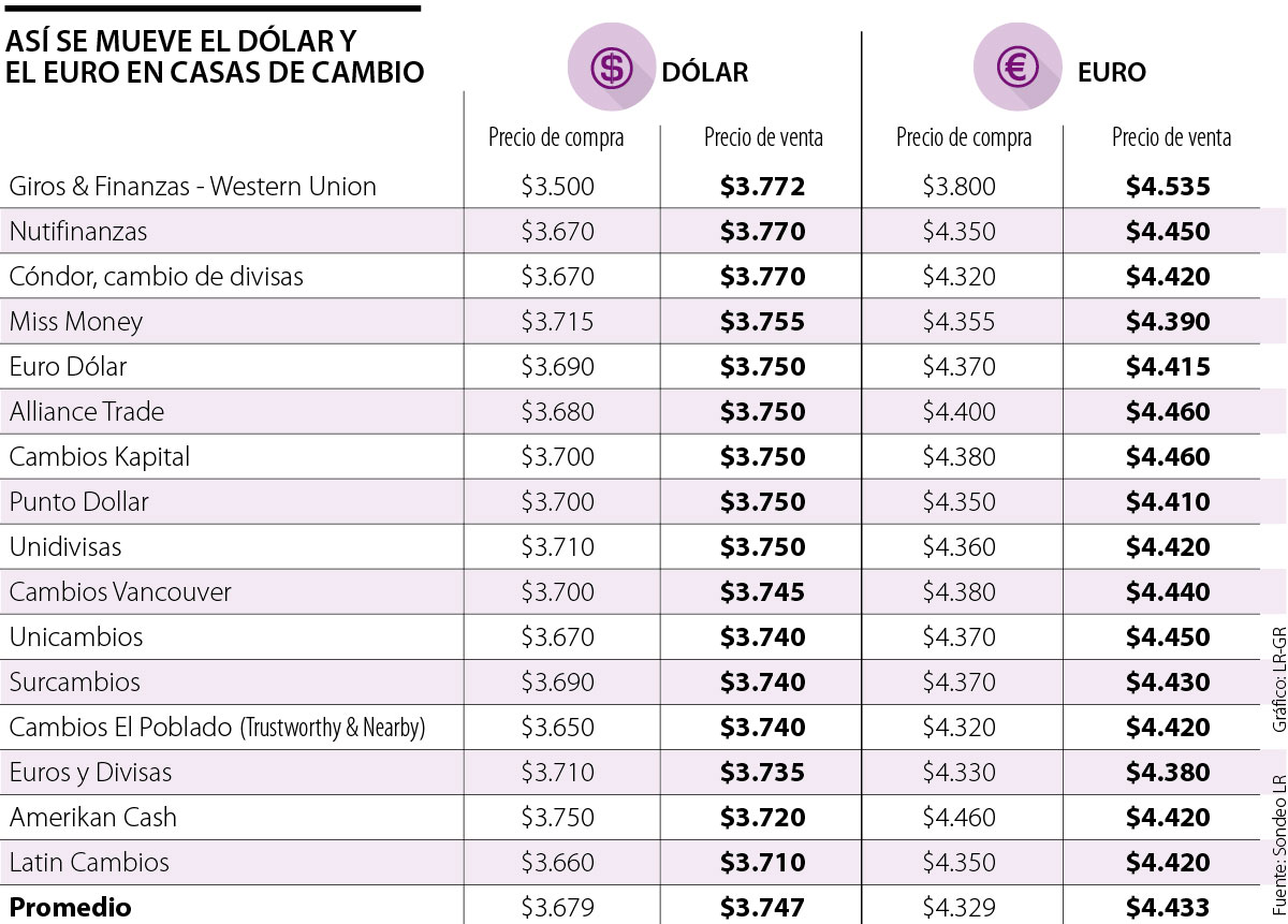 Los puntos de cambio que más caro venden la divisa son Giros & Finanzas, a $3.772; Cóndor, cambio de divisas y Nutifinanzas, a $3.770; Miss Money, a $3.755; y Euro Dólar, a $3.750.