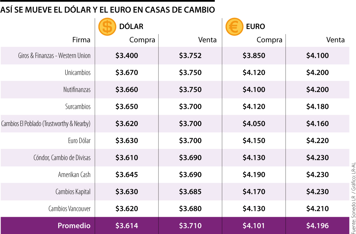 Las casas que más caro venden son Giros & Finanzas, a $3.752; seguida de Unicambios, a $3.750; y Nutifinanzas, que la vende a $3.660