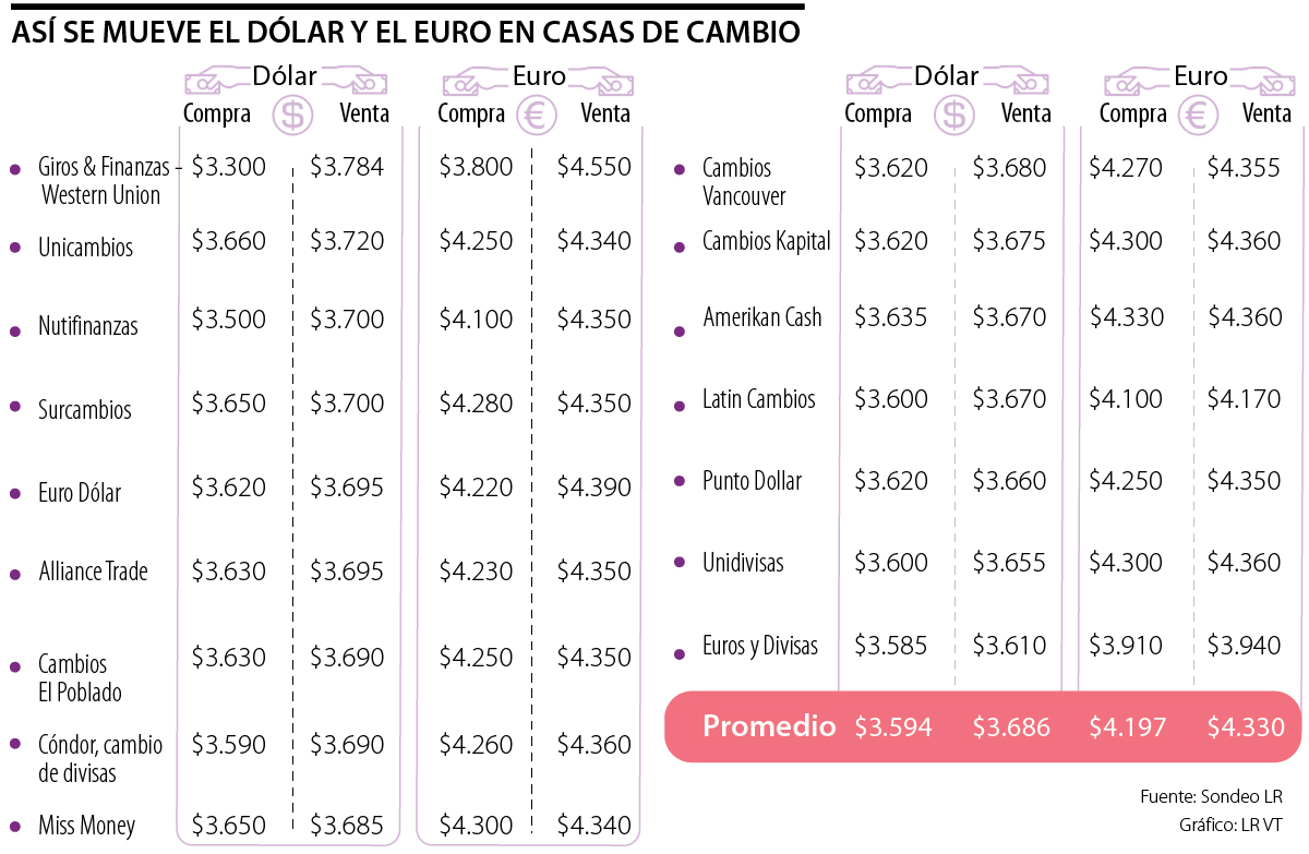 Casi todos los profesionales del cambio consultados por LR ofrecen la moneda por encima de la tasa oficial que manejan los bancos, a excepción de Euros & Divisas y Unidivisas que la ofrecen a $3.610 y $3.655, respectivamente.