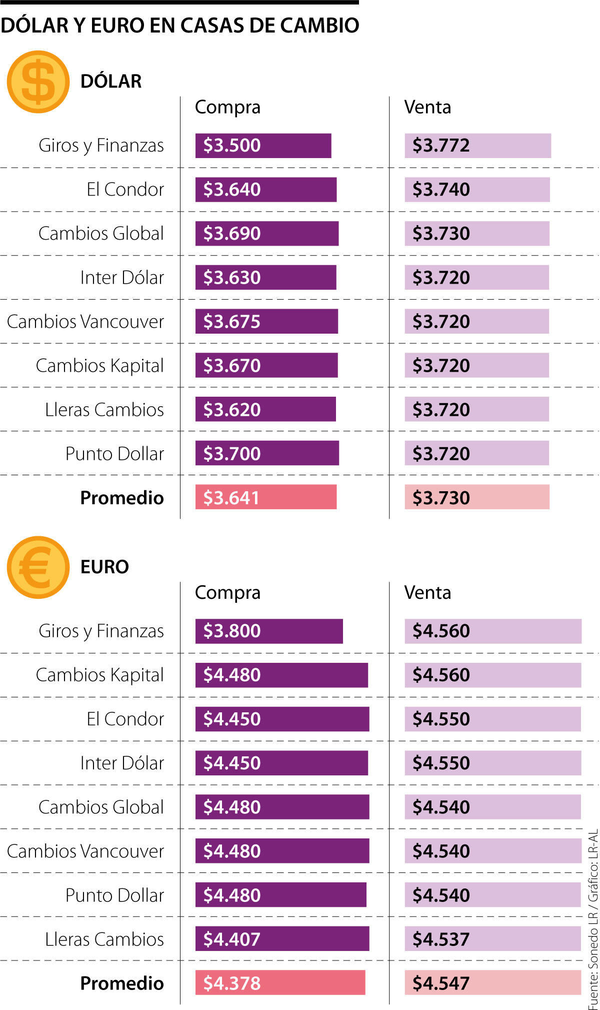 En el sondeo realizado por LR, se evidenció que los precios de venta más altos para la moneda están en Giros y Finanzas ($3.772) y El Cóndor ($3.740). Los valores más bajos están en Inter Dólar, Cambios Vancouver, Cambios Kapital, Lleras Cambios y Punto Dollar ($3.720).