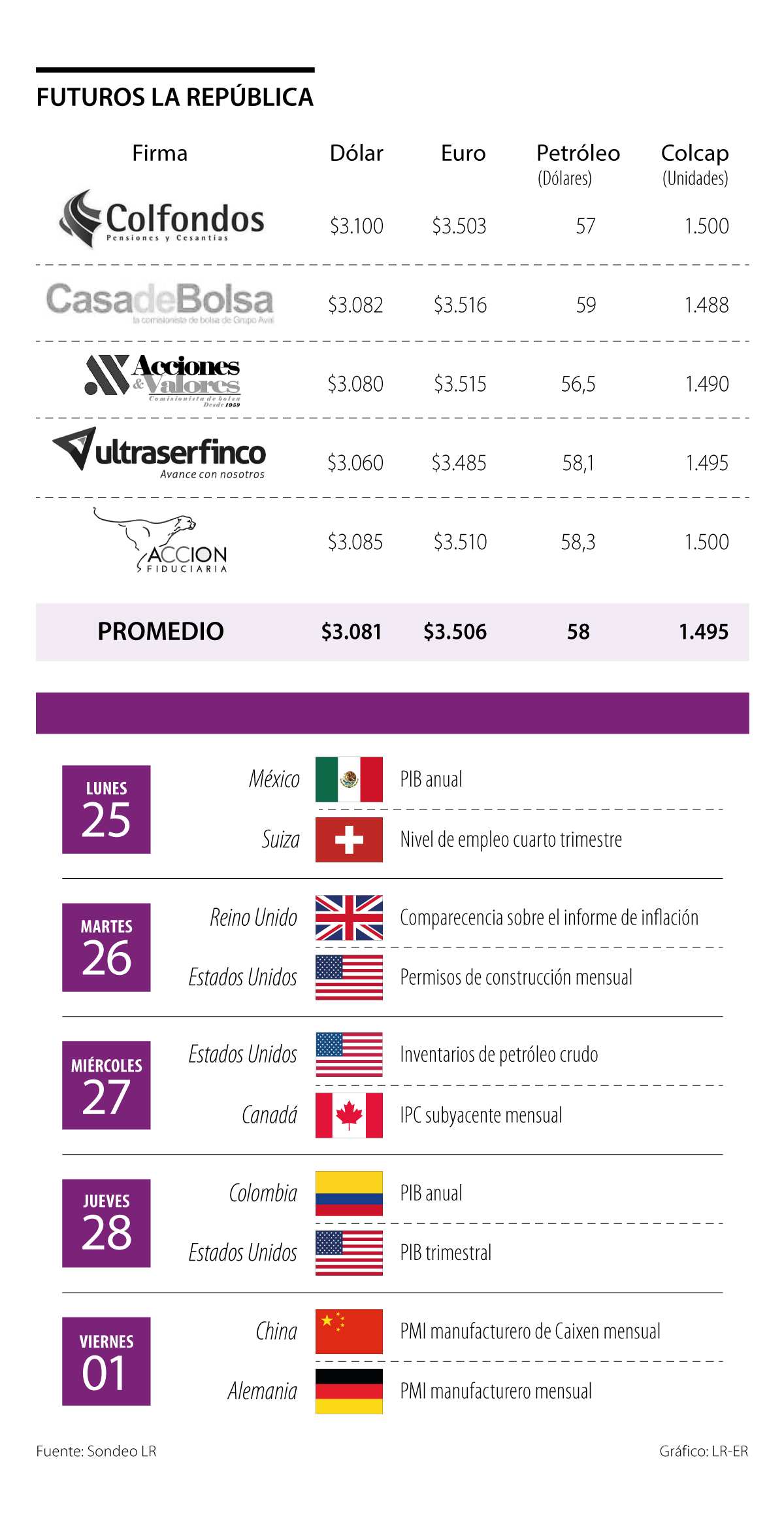 Los analistas consideran que el barril de petróleo de la referencia WTI rondará US$58, alza que se puede explicar por los resultados de los recortes de la Opep. La tendencia podría revertirse si aumentan los inventarios del petróleo crudo en Estados Unidos. En cuanto al euro, el promedio de lo esperado por los analistas es $3.506. Andrés Herrera, gerente de portafolio de Colfondos, resalta que, esta semana, en Europa continuaría la tensión por el Brexit, ya que el acuerdo se votará en el Parlamento Británico.