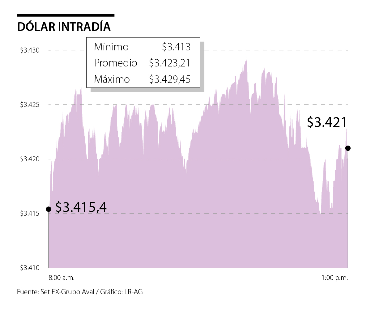 Al cierre de la jornada el viernes, el dólar alcanzó un precio promedio de $3.423,21, lo que representó un alza de $11,76 frente a la Tasa Representativa del Mercado (TRM), que se ubicó en $3.411,45.