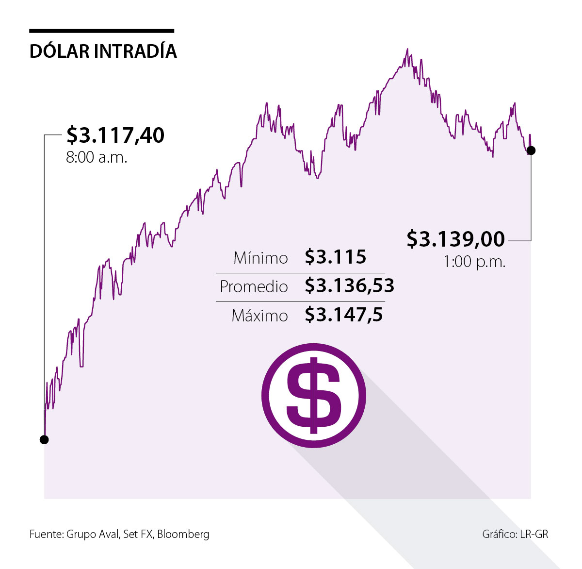 Al cierre de la jornada del lunes, el dólar alcanzó un precio promedio de $3.136,53, lo que representó un alza de $27,21 frente a la Tasa Representativa del Mercado (TRM), que se ubicó ayer en $3.109,32.