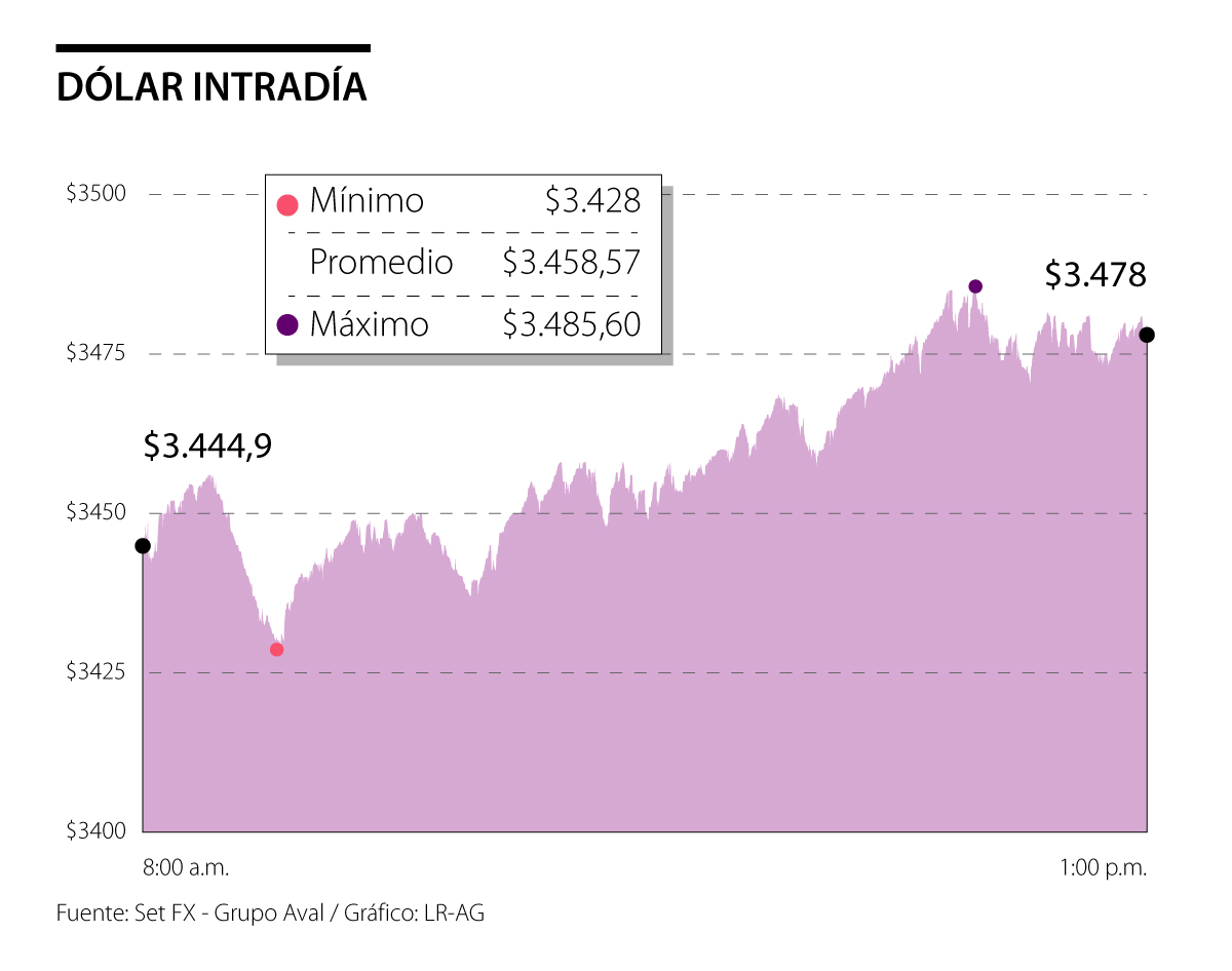 La divisa abrió la jornada con un precio de $3.444,90 y su cierre fue de $3.478. El precio mínimo que se registró en la plataforma Set-Fx fue de $3.428, mientras que el máximo fue $3.485,60. El monto negociado durante la jornada fue de US$1.697,89 millones en 2.613 transacciones.