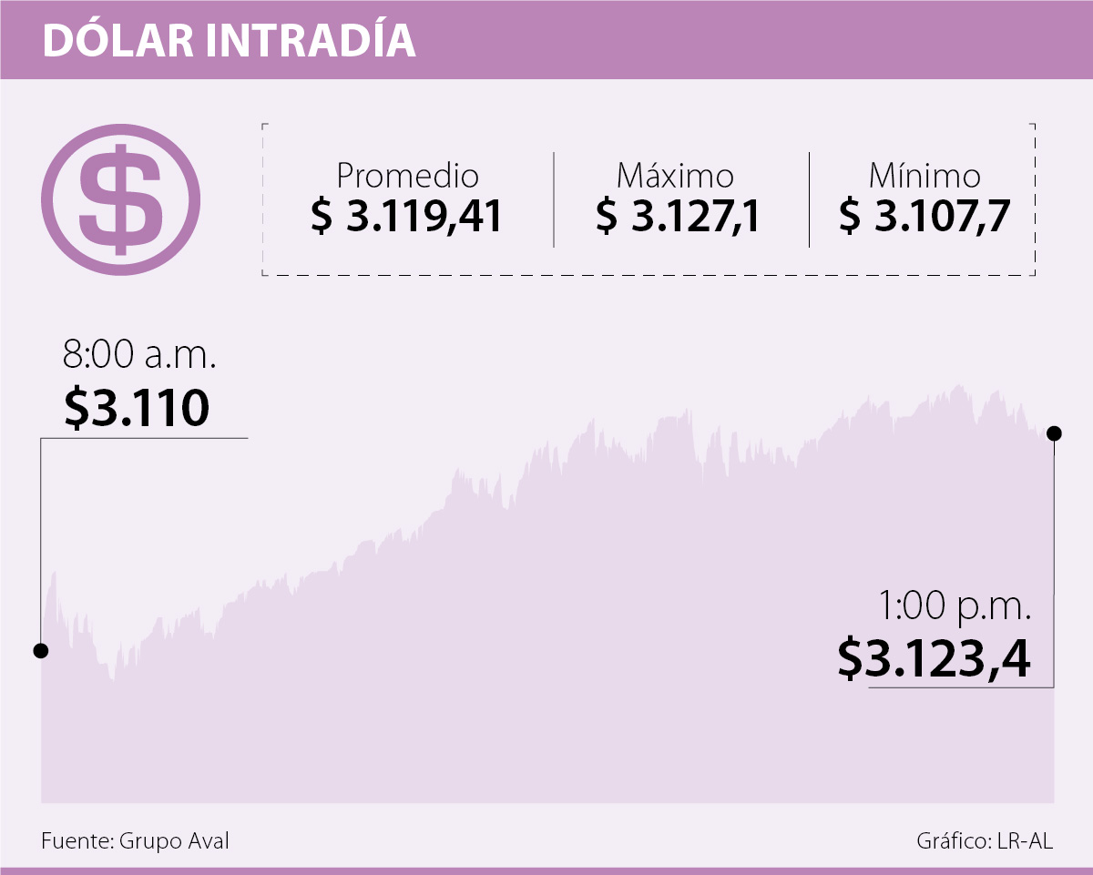 El dólar alcanzó un precio promedio de $3.119,41 el jueves, lo que representó un alza de $7,23 frente a la Tasa Representativa del Mercado (TRM), que se ubicó en un precio de $3.112,18.