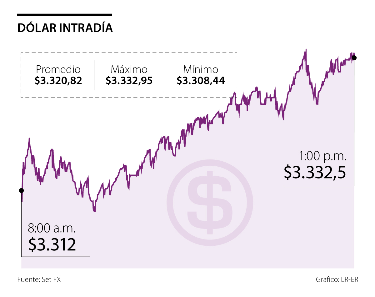 Al cierre de la jornada, el dólar alcanzó un precio promedio de $3.320,82, lo que representó un alza de $7,42 frente a la Tasa Representativa del Mercado (TRM), que se ubicó en $3.313,4.