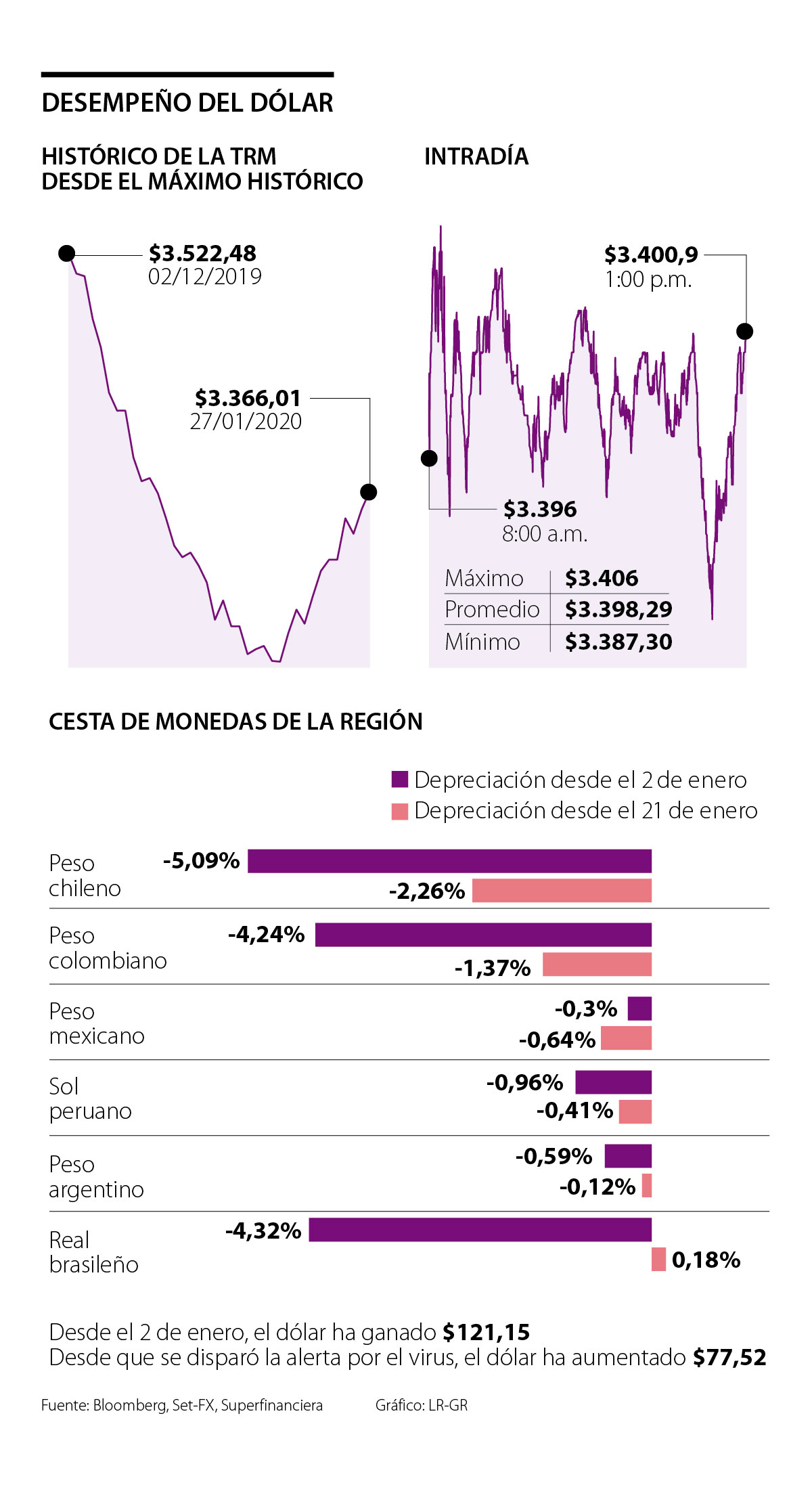 Es la primera vez en lo que va del año que el promedio de la tasa de cambio se acerca tanto a los $3.400. De hecho, en enero, la tasa de cambio ha aumentado $121,5 (4,24%), mientras que desde el pasado 21 de enero, cuando se encendieron las alarmas por el virus que le ha costado la vida a 82 personas, el dólar ha ganado $77,52 (1,37%).