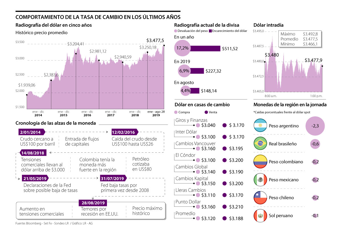 Durante la sesión, el dólar llegó a cotizar en $3.492, el valor más alto en un día. Lo que demuestra que la devaluación del peso colombiano ha sido tal que, en un año, en comparación al promedio al que cotizó el 28 de agosto de 2018, el dólar se ha encarecido $511,52, con una devaluación del peso de 17,2%.