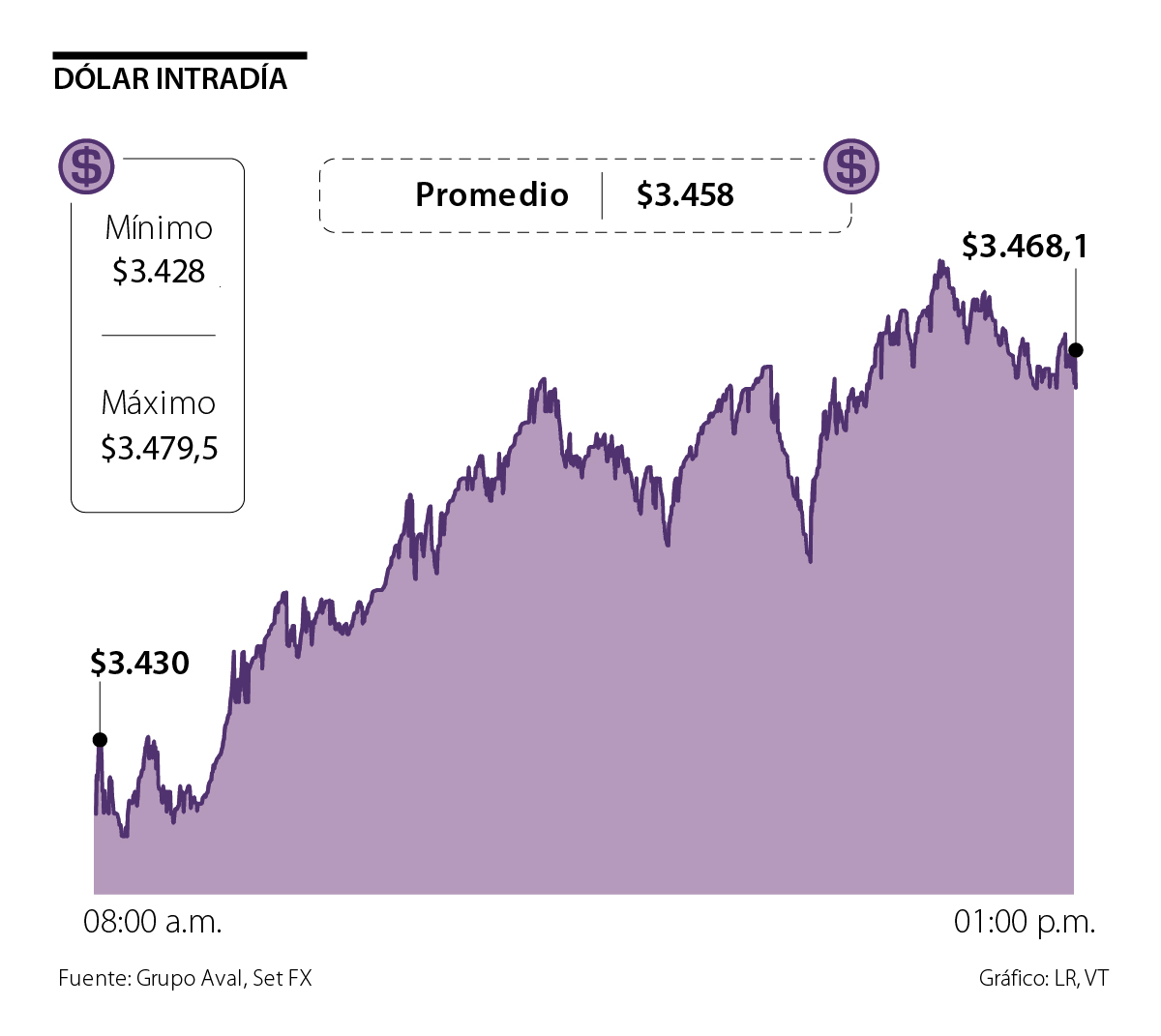Al cierre de la jornada del martes, el dólar alcanzó su segundo precio promedio histórico más alto, pues llegó a $3.458, lo que representó un alza de $25,15 frente a la Tasa Representativa del Mercado (TRM), que se ubicó en $3.432,85.