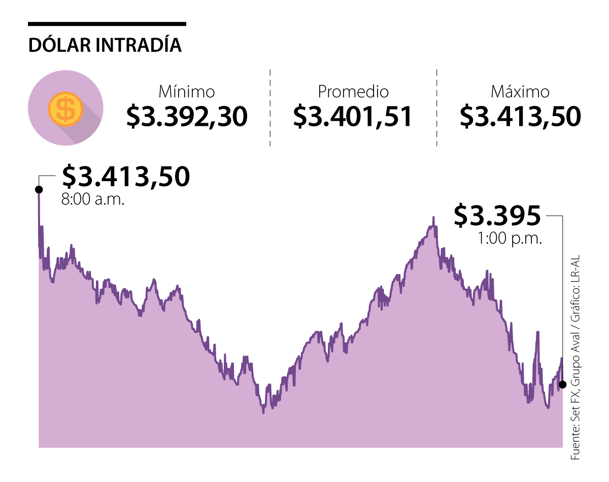 Al cierre de la jornada, el dólar alcanzó un precio promedio de $3.401,51, lo que representó una caída de $21,73 frente a la Tasa Representativa del Mercado (TRM), que se ubicó el lunes en $3.423,24.