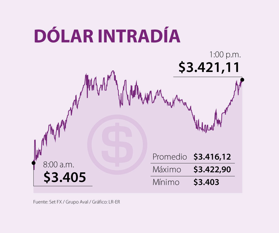 El miércoles, el dólar alcanzó un precio promedio de $3.416,12, lo que representó una caída de $6,32 frente a la tasa representativa del mercado (TRM), que se ubicó ese día en $3.422,44.